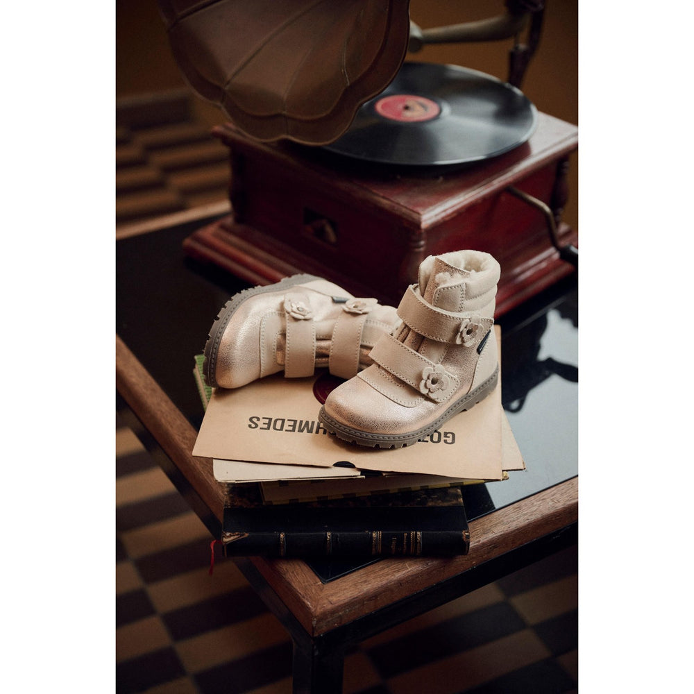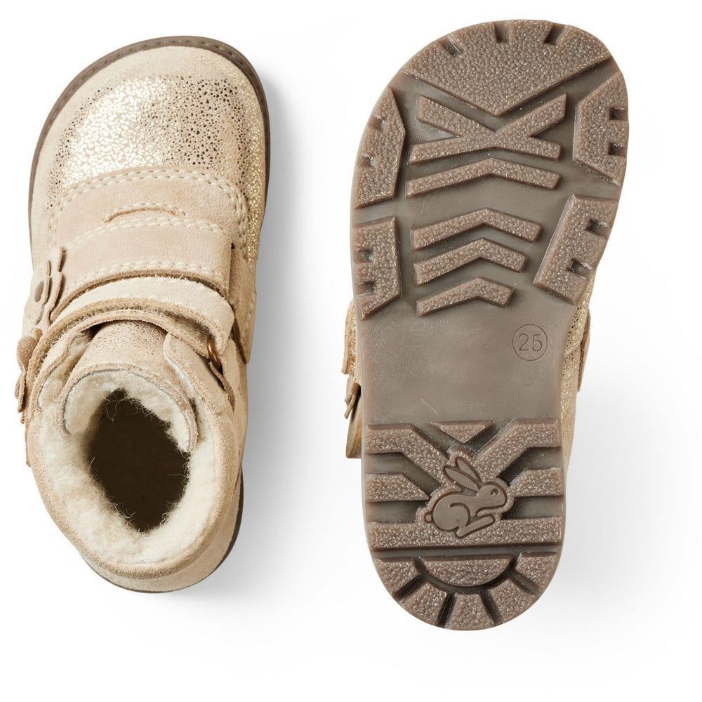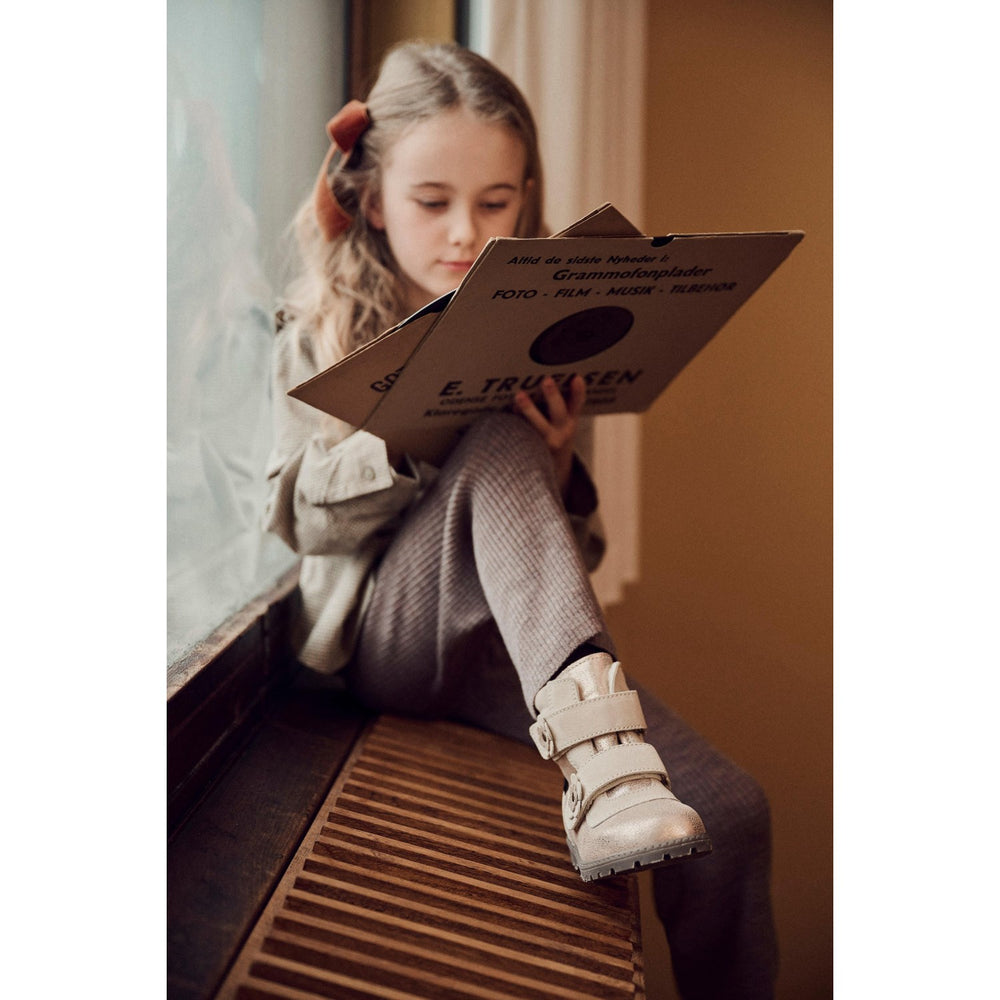 Step into the frosty season with style and warmth wearing the Bundgaard Ivory Glitter Tokker Flower Winter Boots. Perfectly crafted from soft, luxurious suede adorned with a fine suede detail, these boots blend timeless elegance with a touch of sparkle. The classic ivory hue sprinkled with glitter and a playful flower pattern appeals to any child's taste. Designed for slightly older children, the Tokker Flower boasts a wide fit and features like an ultra-cozy wool lining and a waterproof TEX membrane, ensuring little feet stay warm and dry even during the coldest days. The robust TPR outsole provides excellent grip and stability on slippery surfaces, adapting to varying temperatures for safe play. Adding to its convenience, the boots come fitted with Velcro closures for easy on and off — ideal for fostering independence in young ones who are still learning to handle laces. From active school days to adventurous outdoor play, these boots are the go-to for ensuring your child's comfort and freedom during winter adventures. Fit: Wide Insole material: Wool/ cork Lining: 100% Wool Materials: TPR,Wool/ cork,Leather,Suede,100% Wool Outer material: Leather,Suede Outsole material: TPR Removable sole: Yes Shoe width: Wide