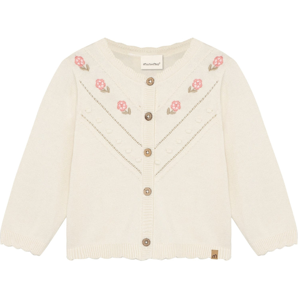 Wrap your little one in the cozy warmth of the Minymo Vanilla Ice Cardigan Knit. This charming knitted cardigan features a solid color accented with a delightful V-shaped embroidered pattern on the chest, enhanced by wavy ribbed trims at the sleeves, collar, and bottom for a touch of whimsy. Crafted from 100% certified organic cotton and adhering to the stringent GOTS - organic CERES-0366 certification, this cardigan combines style with sustainability. The practical button-front design ensures ease of wear, making it perfect for both indoor snuggles and outdoor adventures. Ideal for layering, this cardigan promises both comfort and style for your child's wardrobe. Materials: 100% Cotton