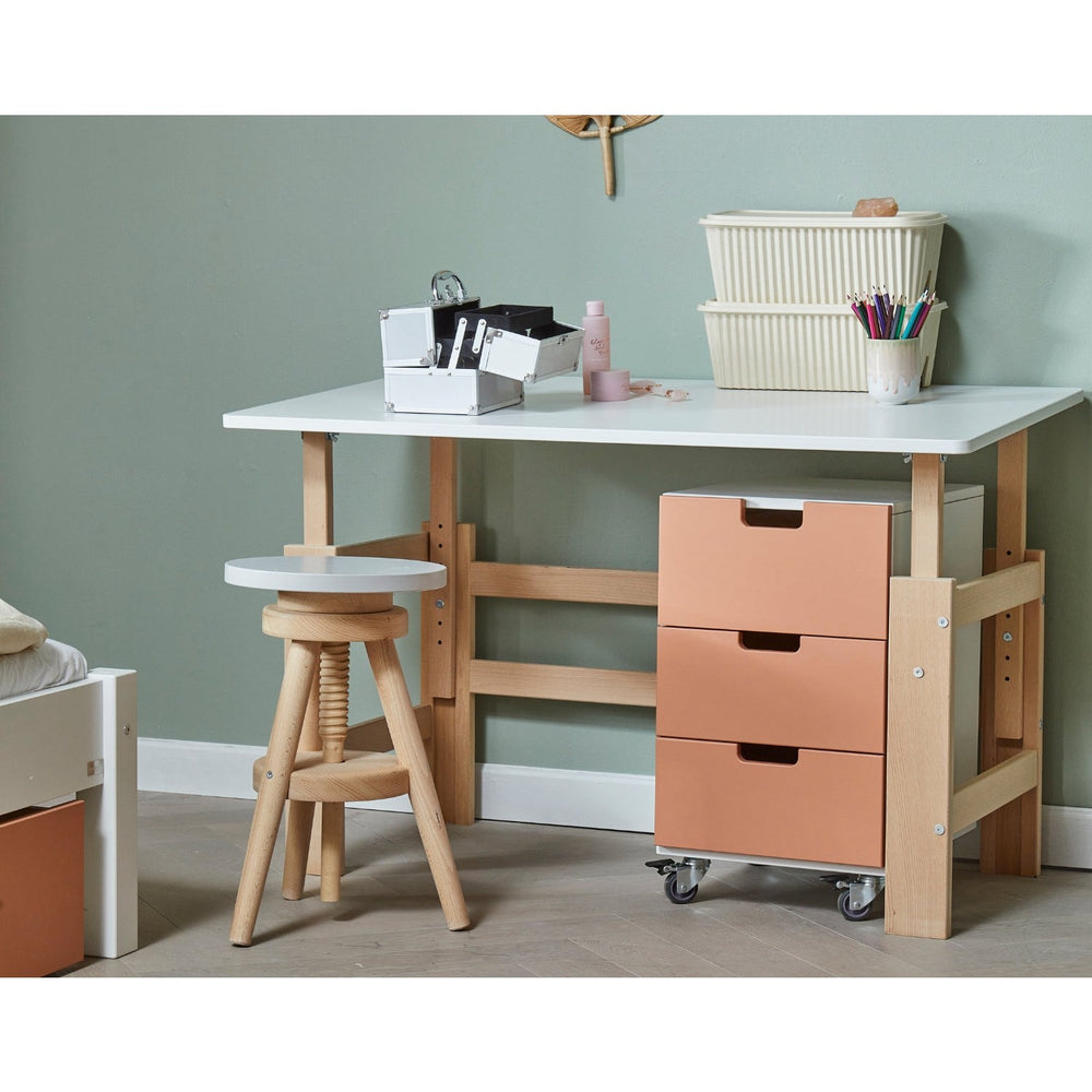 Discover the enchanting Manis-h Snow White Adjustable Desk, a superb addition to your child's room or any cozy corner of your home. Crafted with a colored MDF tabletop and a solid beech frame, this desk exudes a bright and natural appeal. It's designed to grow with your child, featuring an adjustable height and a tiltable surface to cater to their developing needs. This versatility ensures a comfortable and ergonomic workspace ideal for play, studies, and creative adventures. Optimally designed to fit under a high bed, it transforms into a snug yet practical nook. Enhance it further by pairing with a chest of drawers or our stylish shelves, creating a streamlined and efficient environment that stimulates learning and organization. Materials: MDF & Beech wood Measurements: Desk 140cm: 60/80x140x65cm