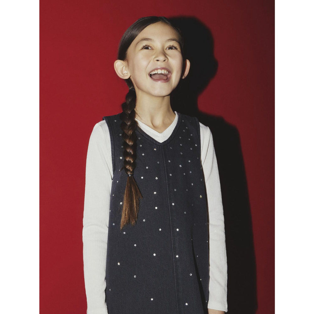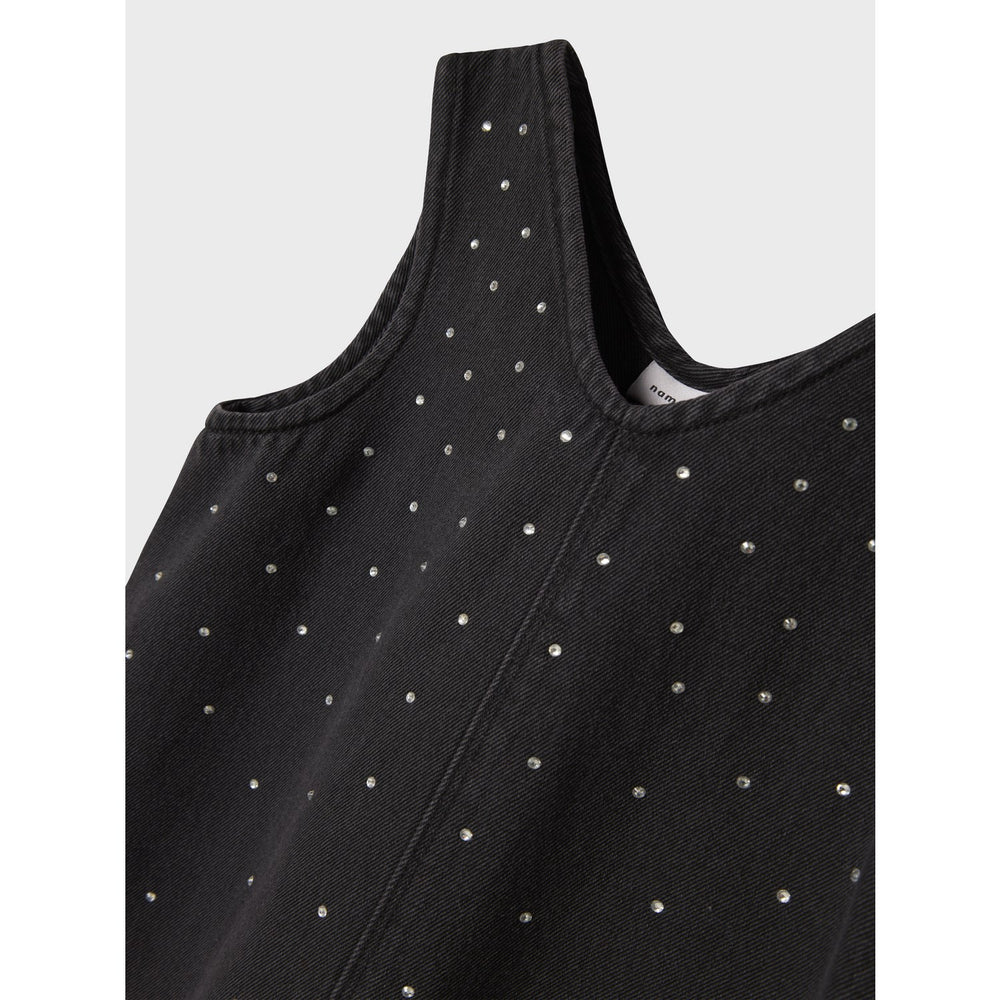 Introducing the Name It Dark Grey Denim Nkfmonala Sl Loose Dress, perfect for every party or special occasion. Crafted from durable denim, it features a unique V-neck and sleeveless design adorned with sparkling rhinestones. The subtle abrasions add character, while the loose fit ensures comfort. Easy to care for, this dress is not just stylish but also practical, making it a delightful addition to any young fashionista's wardrobe. Enjoy seeing your child in this charming ensemble that combines glamour and flair for unforgettable moments.