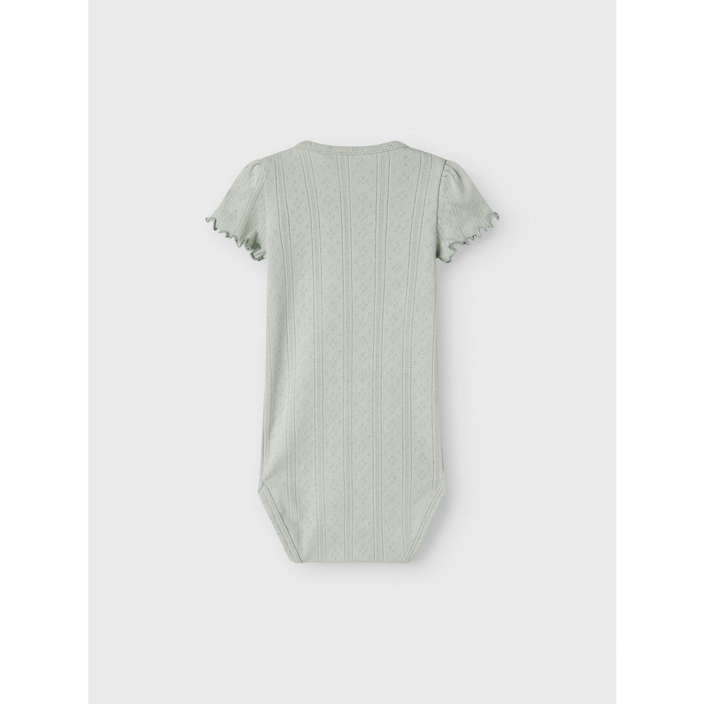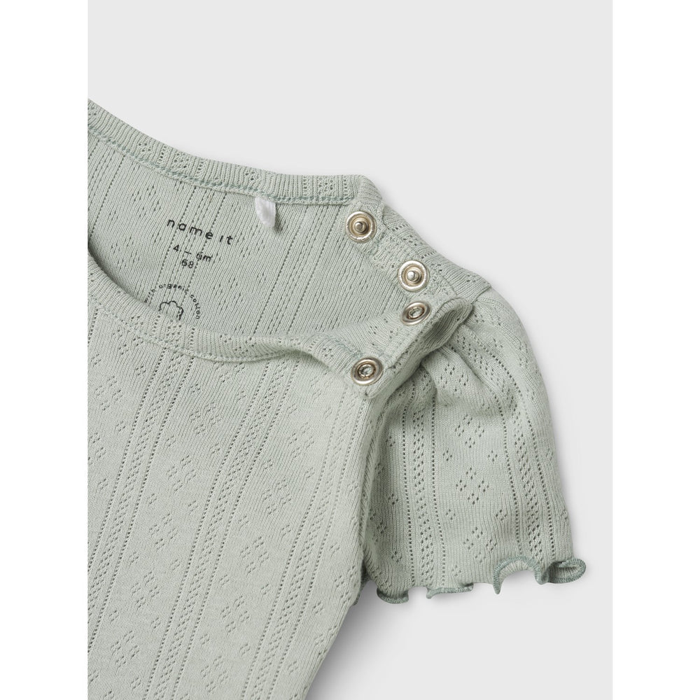 Introduce the delight of comfort and style to your child's ensemble with the Name It Aqua Gray Jsilke Body. This charming bodysuit is crafted from rib-knit material, featuring a vertical, striped pattern that ensures excellent elasticity and a snug fit. Available in a soft aqua gray hue, it is styled with adorable puff sleeves and a convenient round neck, making it ideal for active little ones. The press stud fastening offers hassle-free dressing. Plus, it's a versatile staple for any season. Always remember to keep it away from fire to maintain safety.