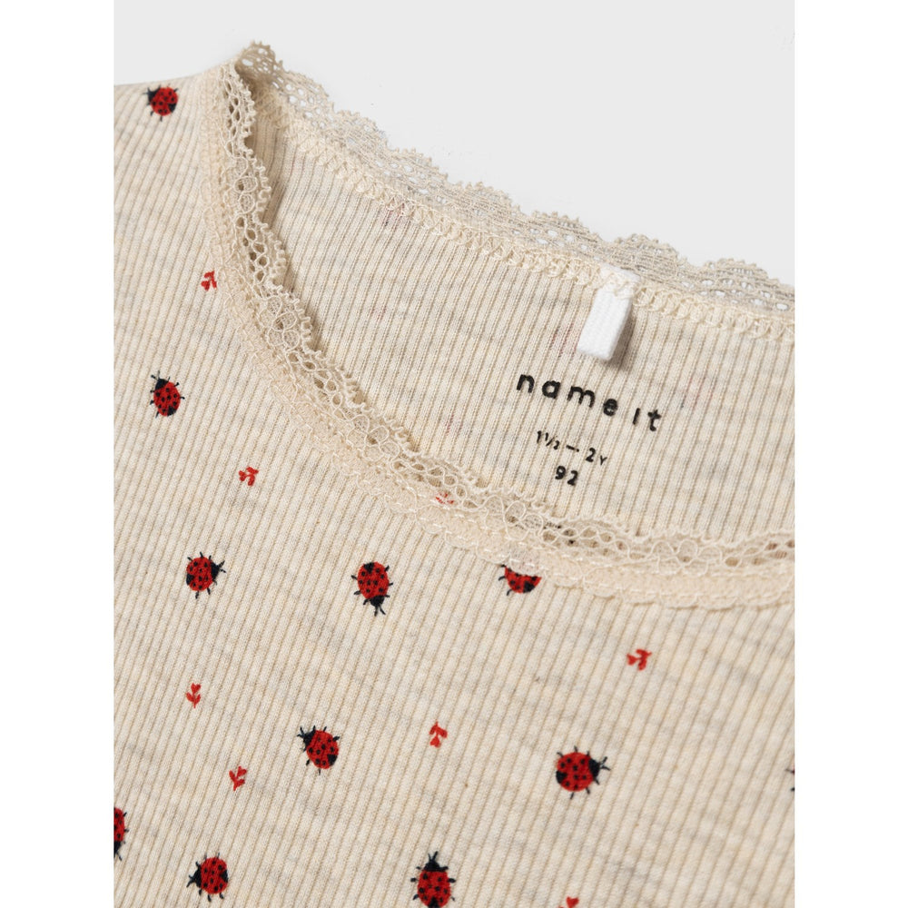 Introducing the charming Name It Peyote Melange Nmfdab M Ls Top—a must-have for your child's wardrobe. This top, designed in a stylish rib knit with a vertical stripe pattern, combines timeless aesthetics with modern comfort. Made of materials that offer great elasticity, it ensures a relaxed and pleasant fit. The repeated print across the surface adds a playful touch, making it a versatile piece for any occasion. Featuring a round neck and long sleeves, this regular fit blouse is not only comfortable but also easy to care for, making it perfect for both daily wear and special events. Let your child experience fashion and comfort in one beautiful garment!