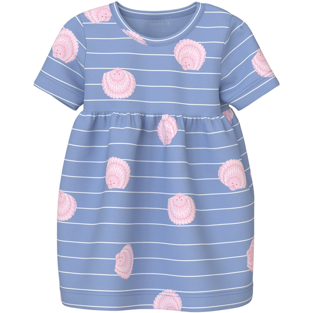 Dress your little one in the stylish and comfy Name It Serenity Seashells Vandora Dress. Crafted from soft, stretchy jersey, this dress ensures all-day comfort with its lightweight design and cozy interior. Featuring a charming seashell print, short sleeves, and a round neckline, it's perfect for any occasion. The regular fit allows freedom of movement, while the press stud fastening makes dressing easy. Plus, it's important to note, keep this garment away from fire for safety. Ideal for both daily wear and special events, this dress combines practicality with fun, fashionable flair.