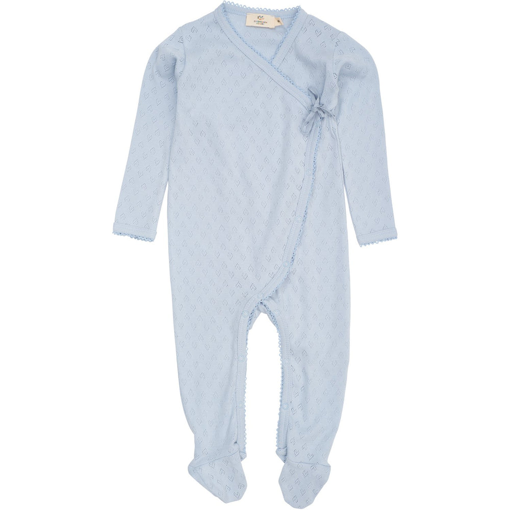 Delightfully designed for the little ones, the Copenhagen Colors Dusty Blue Pointelle Cross-Over Full Body Onesie features superb craftsmanship for ultimate comfort. Made from 100% organic cotton, this GOTS certified outfit is perfect for sensitive skin. It showcases an enchanting pointelle knit with tiny hearts, available in colors like cream, light rose, light yellow, and classic navy. Its long sleeves and convenient cross-over front make dressing a breeze. This onesie retains its pristine condition through multiple washes at 40 degrees, resisting lint and color fading effectively. Ideal for both everyday comfort and enduring style, it’s a wardrobe essential that provides peace and practicality for active tots.