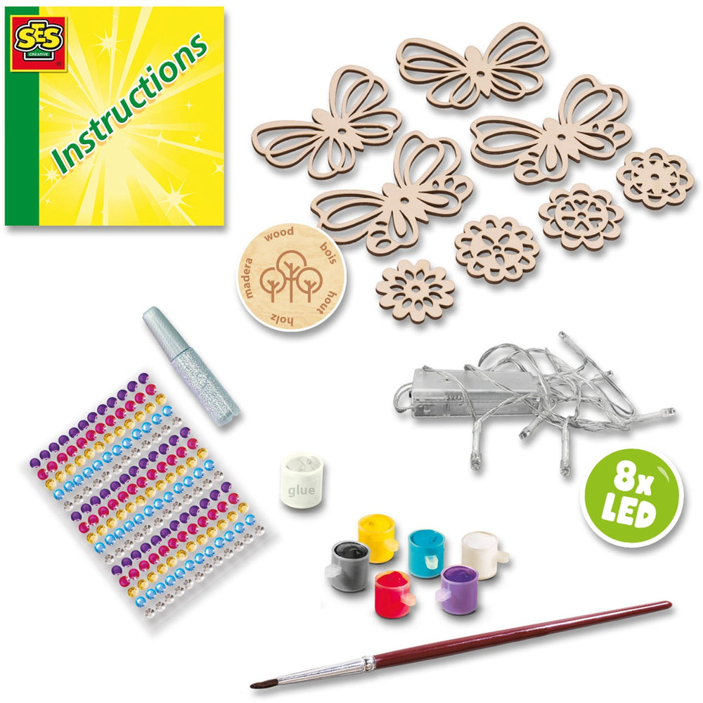 Contents: String lights with 8 LED lights, 5 x self-adhesive diamonds, paint, glue, brush, butterflies, flowers and instructions
