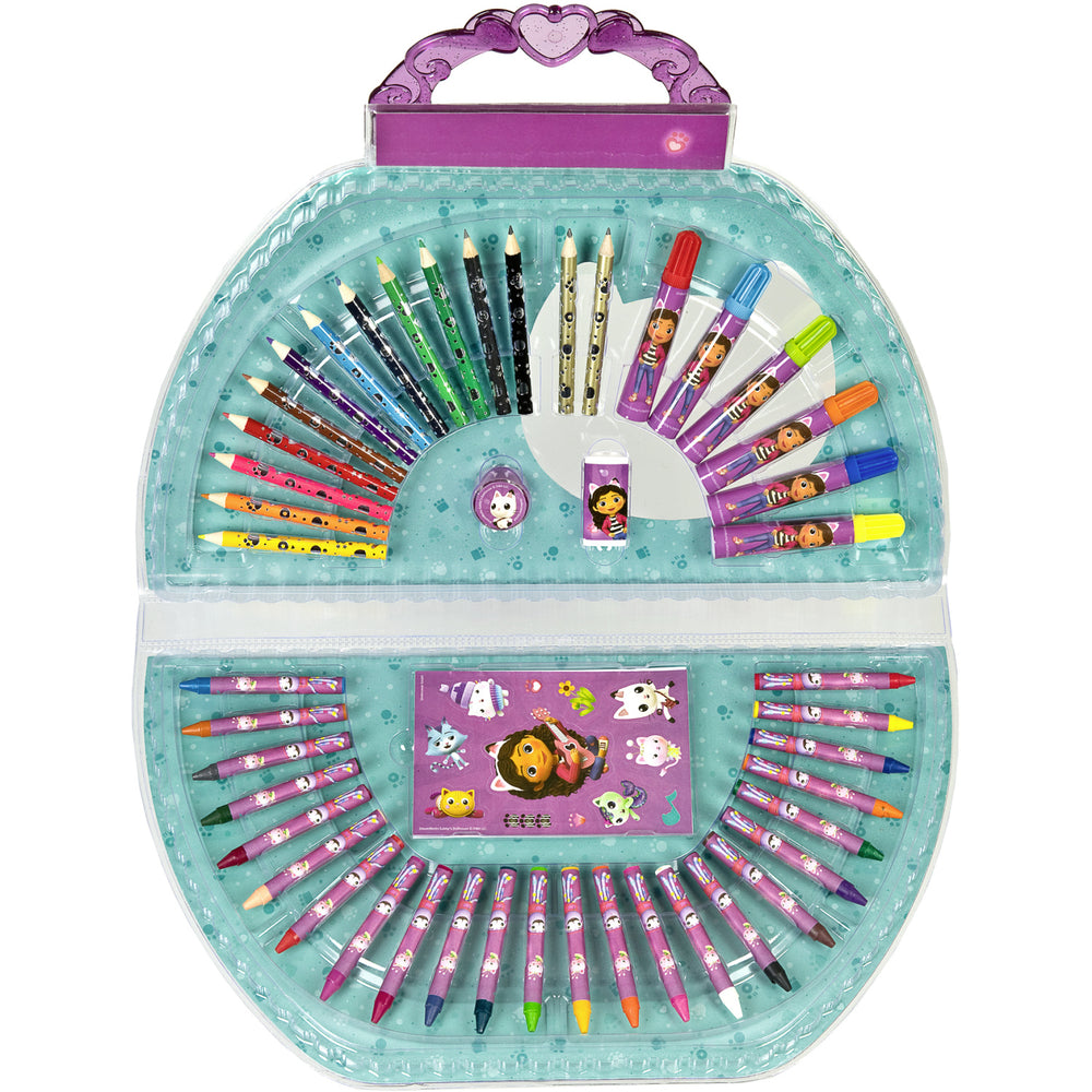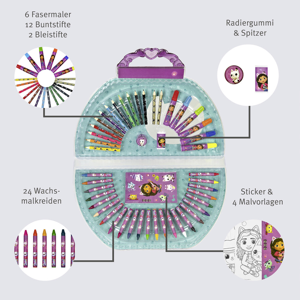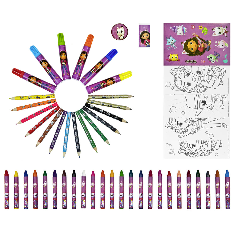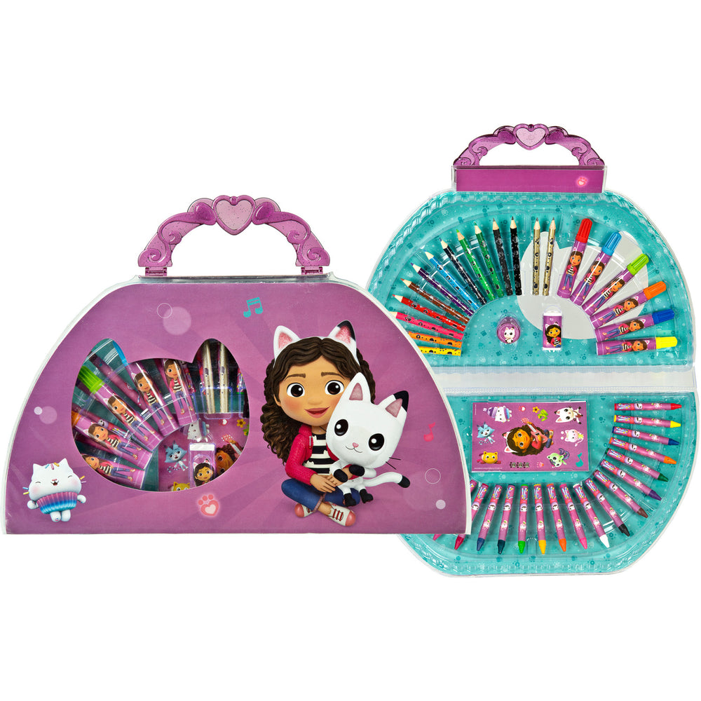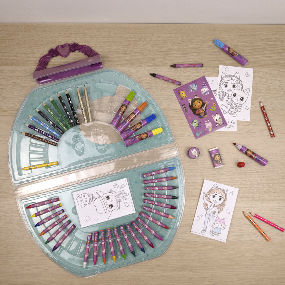 Introduce your child to the delightful world of creativity with Gabby's Dollhouse Painting Bag from Undercover. This 51-piece set is perfectly tailored for young artists, featuring 12 mini crayons, 6 vibrant markers, 24 colorful chalks, and much more, including an eraser, 2 mini pencils, nibs, 4 engaging posters, and a fun sticker sheet. Designed for safety and easy use, this kit is ideal for children, offering educational value through engaging and interactive play. Its compact design ensures easy portability and clean storage, making it an excellent choice for encouraging artistic expressions anywhere, anytime.