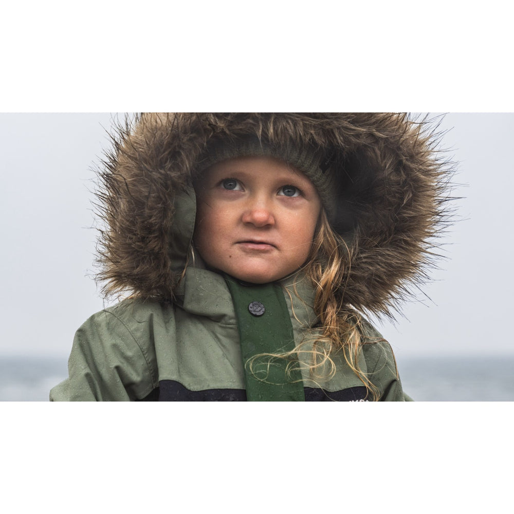Every detail is designed with your child's comfort and safety in mind, from the ergonomic cut that allows free movement to the chin guard that prevents zipper irritation. The snowsuit includes an extendable size feature in the legs and sleeves for growing kids, and a name label to ensure it always finds its way home. Practical storage is provided with a front pocket, skipass pocket, and a loop inside for a reflector, increasing visibility. The suit is easily adjustable around the waist and sleeves, and includes features like a thumbhole and glove security loop for added convenience.