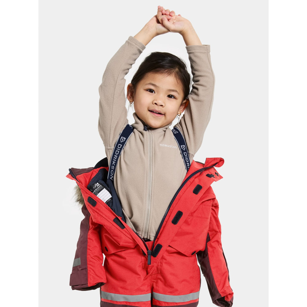 Discover the ultimate protection and style for your little adventurers with the Didriksons Pomme Red Bjärven Kds Cover 4 snowsuit. Expertly crafted with an ergonomic cut and featuring a robust fabric mapping technique, this snowsuit boasts an adjustable and detachable hood with synthetic fur, ensuring your child stays warm and adaptable to any winter weather condition. The bright red hue and reflective logos enhance visibility, while the adjustable leg ends with silicone foot straps and snow gaiters keep the snow out, ensuring complete dryness and comfort.
