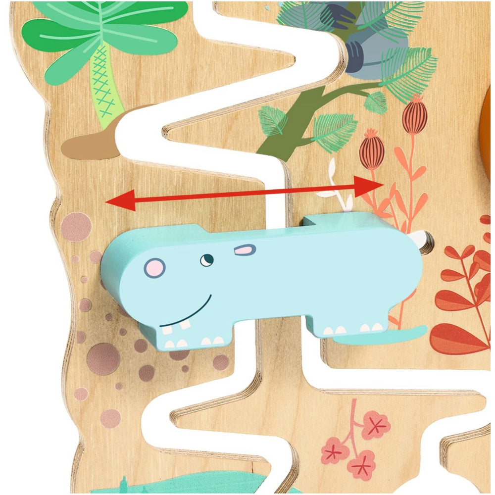 • Along the way, they are stopped by 3 animals - the lion, giraffe and hippopotamus - which the child must turn, pull or move to give the discs free rein