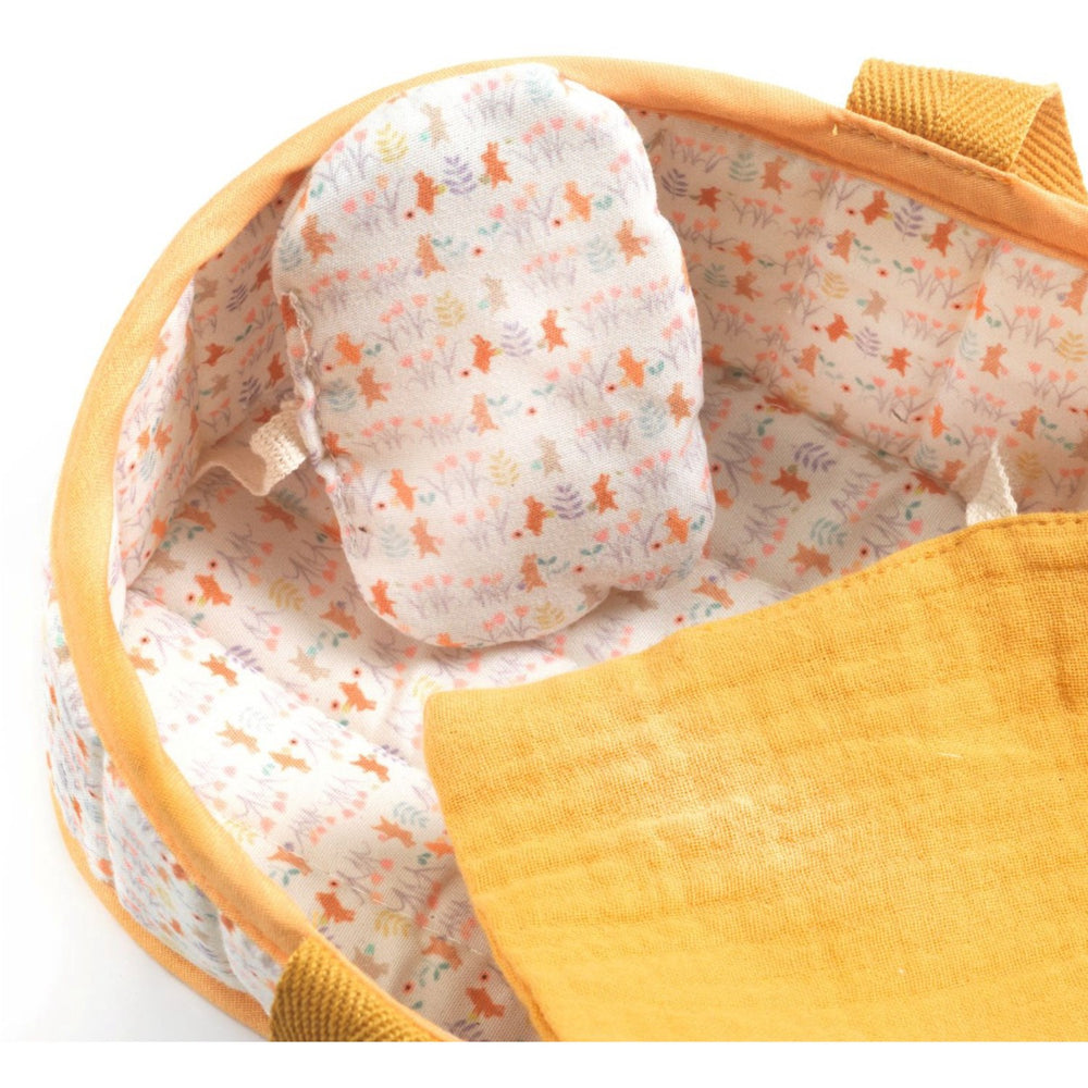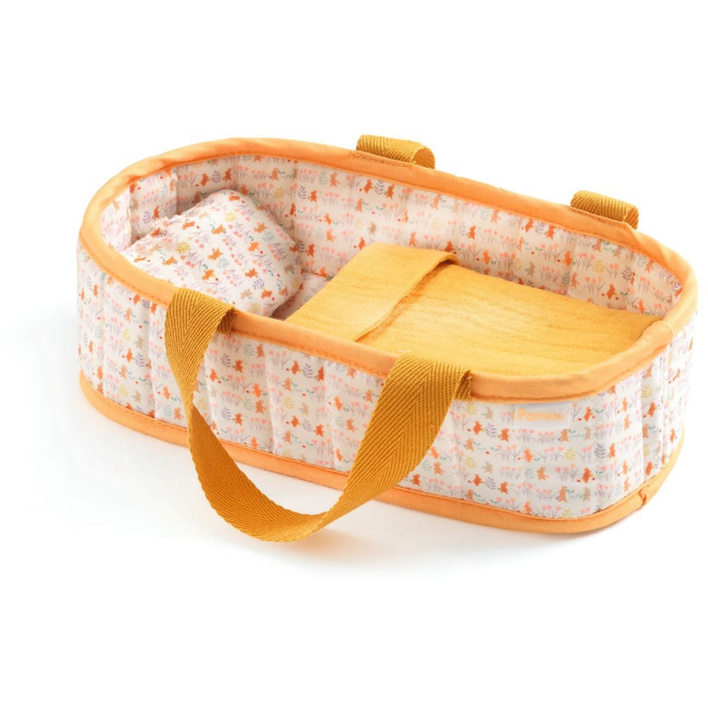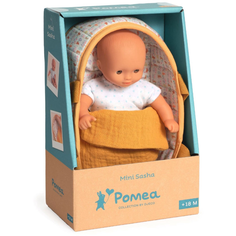 Introducing the delightful Sasha I Lift Doll from Djeco Pomea Mini, designed to captivate and comfort young children. Sasha, a 20 cm doll with a serene smiling face and securely fixed eyes, features a soft, flexible body wrapped in cozy printed nightwear, making her an ideal cuddle buddy. Her body is eco-consciously stuffed with 100% recycled fibers, and her limbs are crafted from soft, fragrance-free vinyl, ensuring safety and gentleness for little ones. This set includes a charming, lightweight Moses basket complete with fixed straps for easy handling. The basket's elegant quilted design enhances its visual appeal, and the attached pillow and blanket, secured with a small bow, ensure these accessories remain together during play and storage. Designed for portability and ease of use, the entire set, including the doll and Moses basket, is conveniently machine washable at 30°C, simplifying maintenance. Perfect for small hands, the compact size of Sasha encourages engagement and imaginative play, fostering developmental skills in a playful environment. This beautifully crafted doll and basket set is tailored for children, providing both a beloved playmate and a comforting presence at bedtime or during travel.