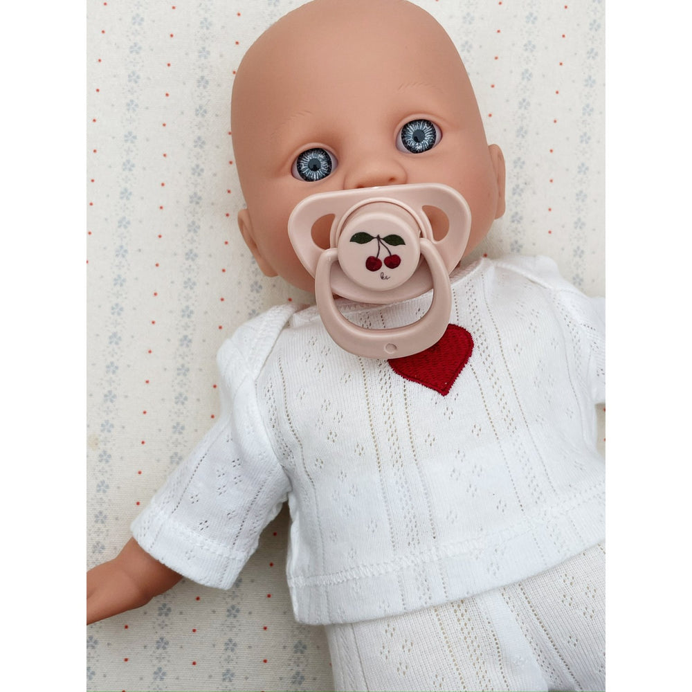 Meet Nelly, the doll from Konges Sløjd, a delightful companion for your child. Crafted with safety and educational value in mind, Nelly features life-like eyes and comes in soft, child-friendly cotton pajamas with a pacifier to engage your little one. Its size makes it ideal for easy portability and storage, ensuring that it's not only a source of fun but also a comforting presence. Perfect for children looking for a gentle and interactive friend. Materials: Doll: Vinyl, Body Shell: Cotton, Filling: Polyester, Pacifier: PP