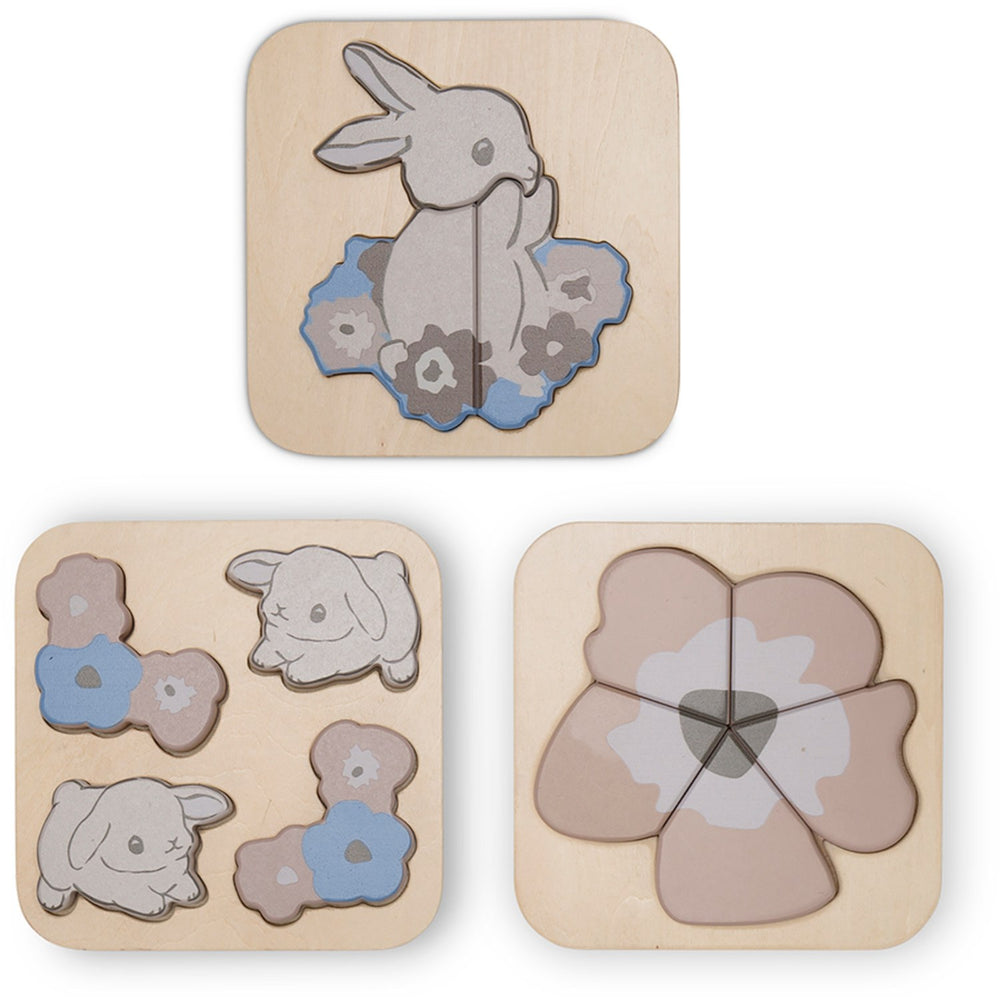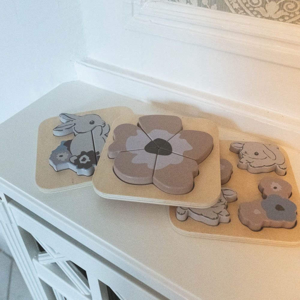 Discover the joy of learning with the That's Mine Bunny Toby Jigsaw Puzzle 3-pack. This charming collection of puzzles is perfect for introducing the youngest family members to imaginative and developmental play. With three different puzzles that offer different levels of difficulty, your child can gradually improve their skills. From a puzzle with 3 pieces, ideal to start with, to more complex puzzles with 4 and 5 pieces that challenge and develop the child's abilities further. Each piece is designed with the child's safety in mind, made in large, sturdy sizes that ensure easy handling for little fingers. This approach not only strengthens safety, but also the durability of the product. The puzzle pieces even have special indentations that make it easier for your child to position them correctly, supporting the development of hand-eye coordination and fine motor skills. The compact design and lightweight material make these puzzles ideal for taking on the go, and cleaning is simple, ensuring a lasting neat and inviting appearance. With the Bunny Toby puzzle, your child can not only enjoy hours of interactive and educational play, but also gain a sense of mastery and independence as they learn to solve each puzzle.