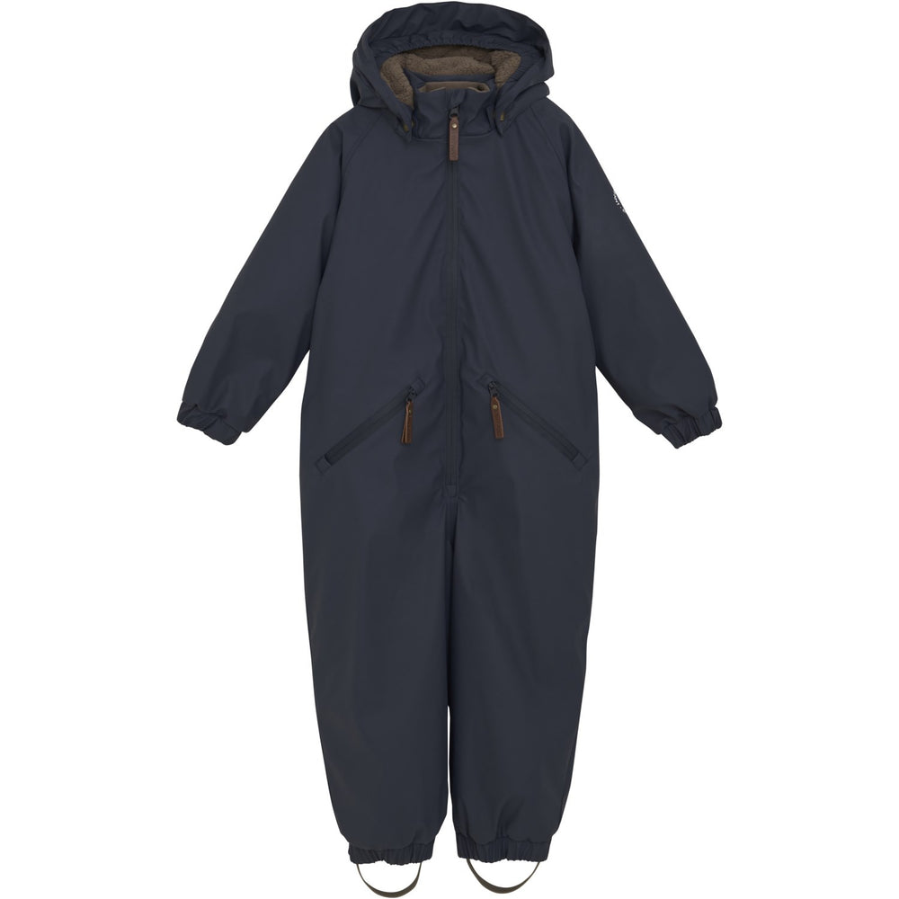 The snowsuit has a detachable hood and adjustable rubber boot straps that can be hidden under the boots so that it does not creep up the leg