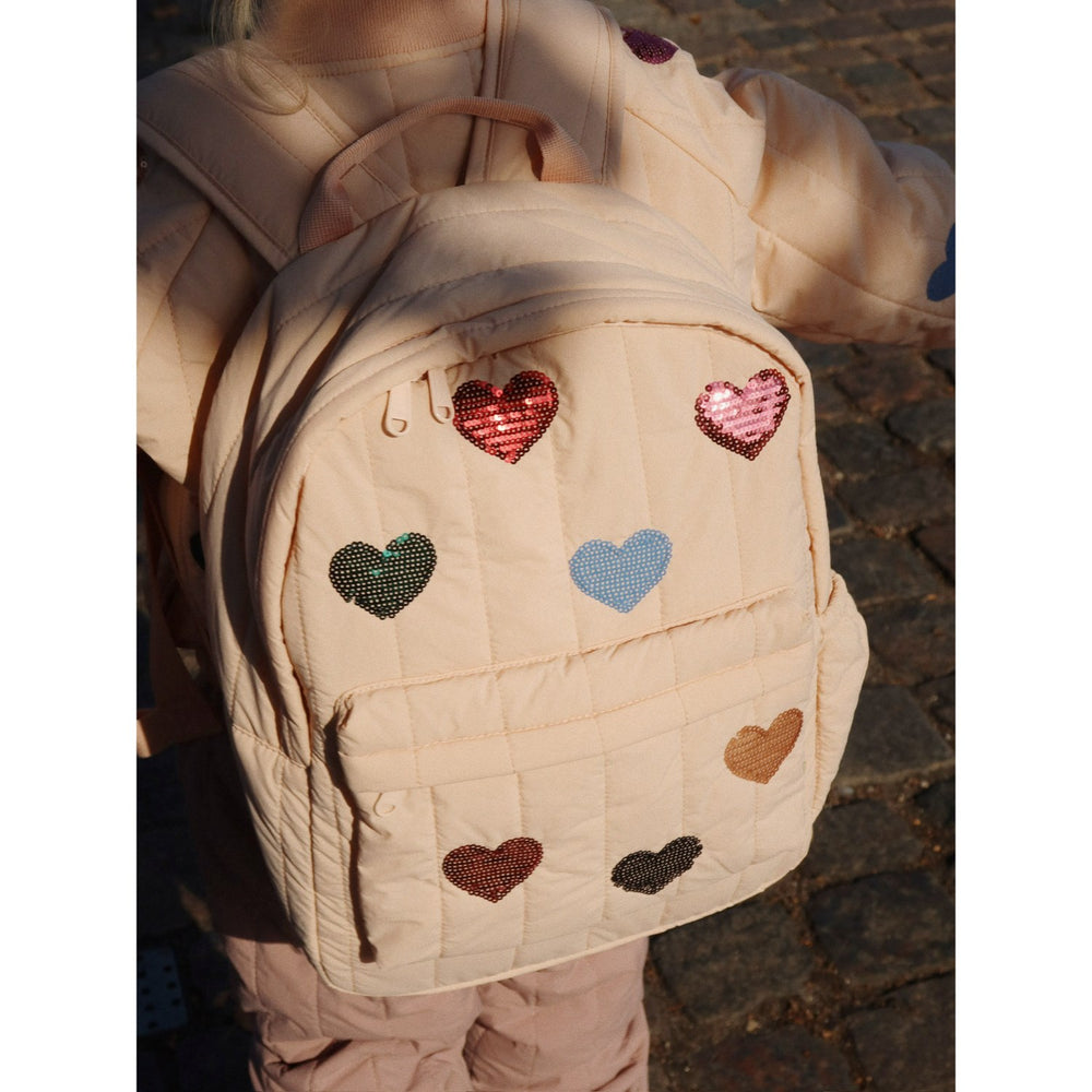 Introducing the Konges Sløjd Cameo Rose Juno Quilted Sequin Backpack Midi: a child's perfect companion! This soft, lightweight backpack features a quilted design and comes equipped with a handy side pocket for bottles and a small zippered front pocket for smaller essentials. The practical chest strap adjusts weight distribution and offers extra support, ensuring your little one's comfort and ease during use. Ideal for both daily adventures and school use, this backpack not only looks great but also keeps everything organized and within easy reach.