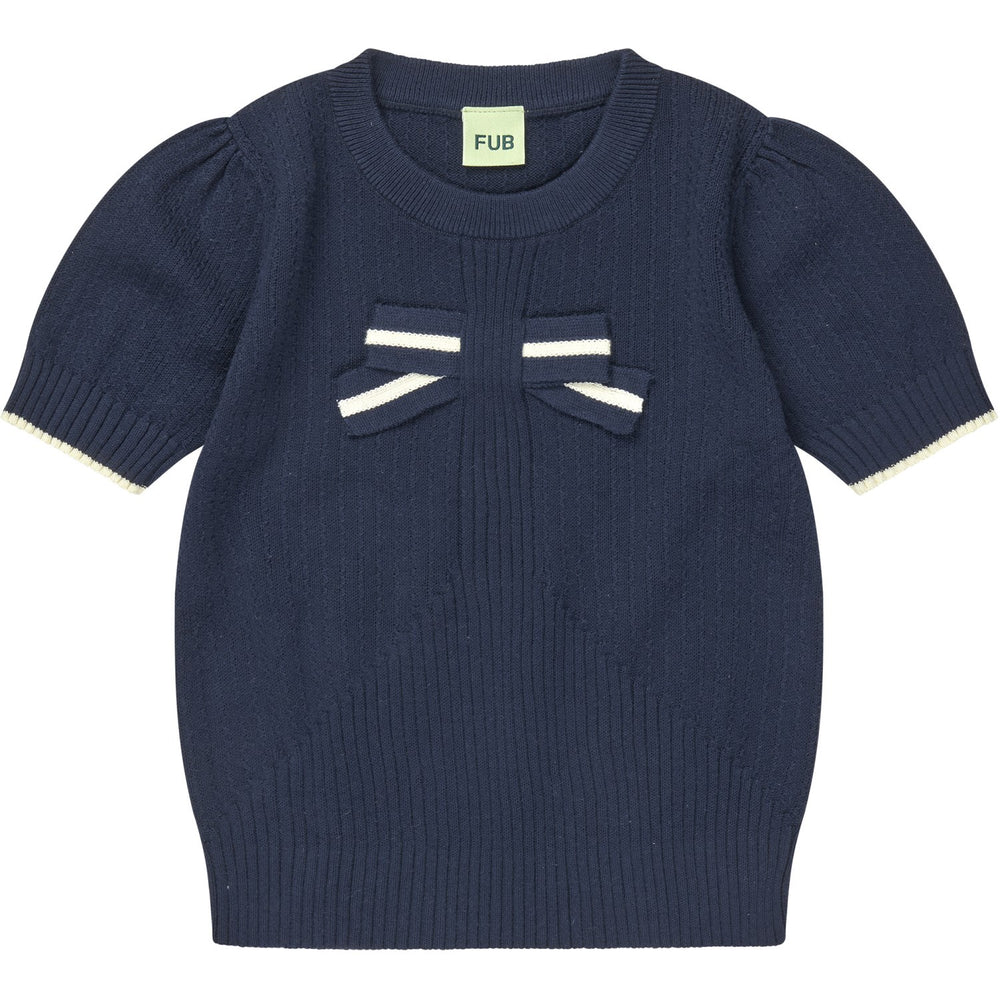 Discover the charm of our FUB dark navy Bow Tee, perfect for your little one's wardrobe. Crafted from 100% certified organic cotton, this t-shirt is both eco-friendly and gentle on sensitive skin. It showcases short puff sleeves and a ribbed neckline, enhanced with a contrasted stripe at the sleeve edges, adding a touch of sophistication. The highlight of this tee is the large striped bow at the front, giving it a playful yet stylish look. Crafted to ensure comfort with its regular fit and soft, breathable fabric, this tee is ideal for everyday wear and easy to care for. Available in varying sizes, please note the price variation in larger sizes. Ideal for active play or casual outings, this tee combines durability, comfort, and style effortlessly.