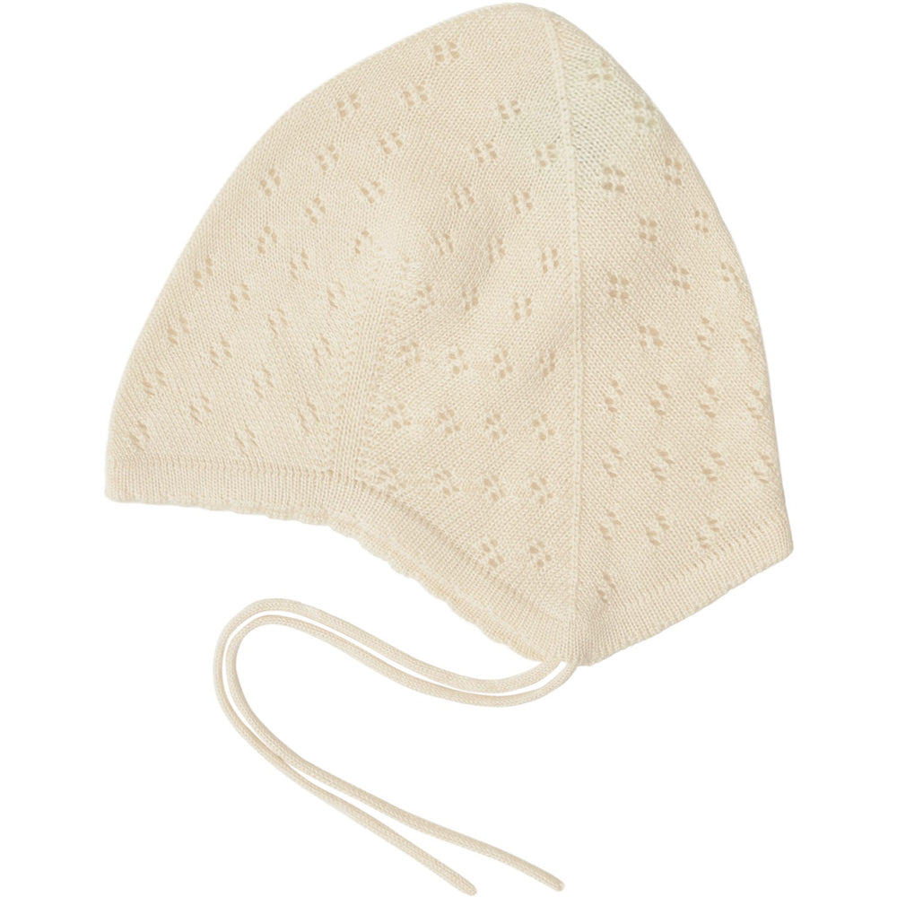 Discover the charm and practicality of the FUB Ecru Baby Pointelle Hat, designed especially for your little one. Crafted from 100% OEKOTEX®, RWS, and BLUESIGN® certified merino wool, this hat ensures your baby's comfort and safety, free from harmful chemicals and ethically sourced. The delicate pointelle pattern combined with intricate lace edges and fine knitted ribbons adds a touch of elegance, while the thoughtful shaping details provide a snug and perfect fit. Moreover, the eco-friendly technology treatment allows for easy machine washing without chlorine or other halogens, making care hassle-free. Ideal for keeping your baby cozy and stylish, this hat is an essential addition to their wardrobe. Materials: 100% Merino wool