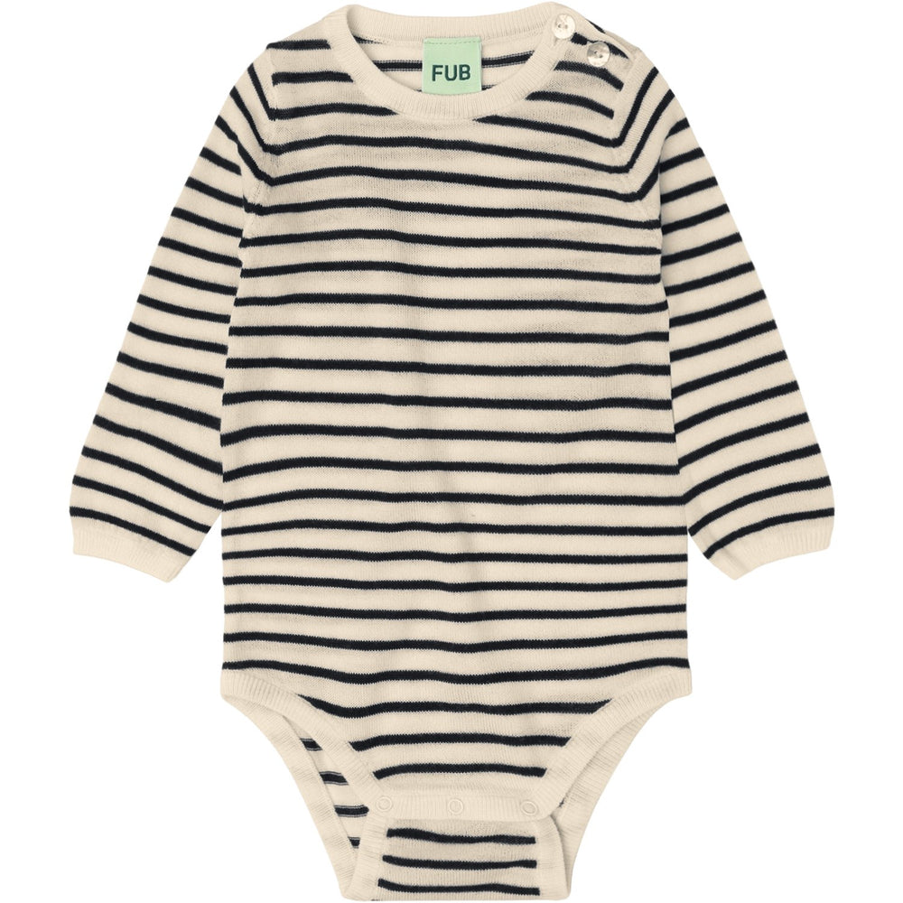 Wrap your precious one in the comforting embrace of our FUB Ecru/Dark Navy Baby Body, crafted from 100% OEKOTEX®, RWS, and BLUESIGN® certified merino wool. Light and breathable, this knitted single jersey bodysuit is adorned with classic stripes, featuring long sleeves, a round neckline, and snug ribbed hems. Practicality meets style with a convenient shoulder button closure using pearl shell buttons and easy-to-use snap fasteners at the crotch. This charming bodysuit is treated with an eco-friendly technology that ensures it’s machine washable, maintaining softness without chlorine or other harsh chemicals. Perfect for daily wear, this baby body is designed to provide ultimate comfort and ease, making it an essential in your child’s wardrobe.