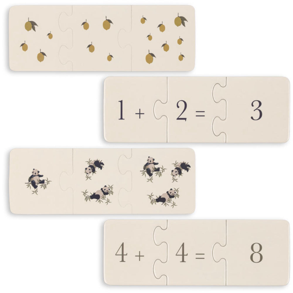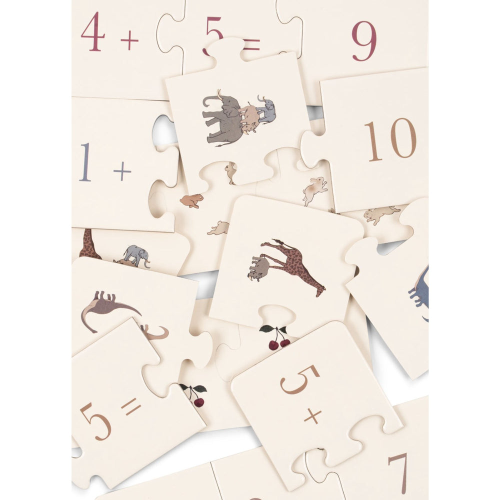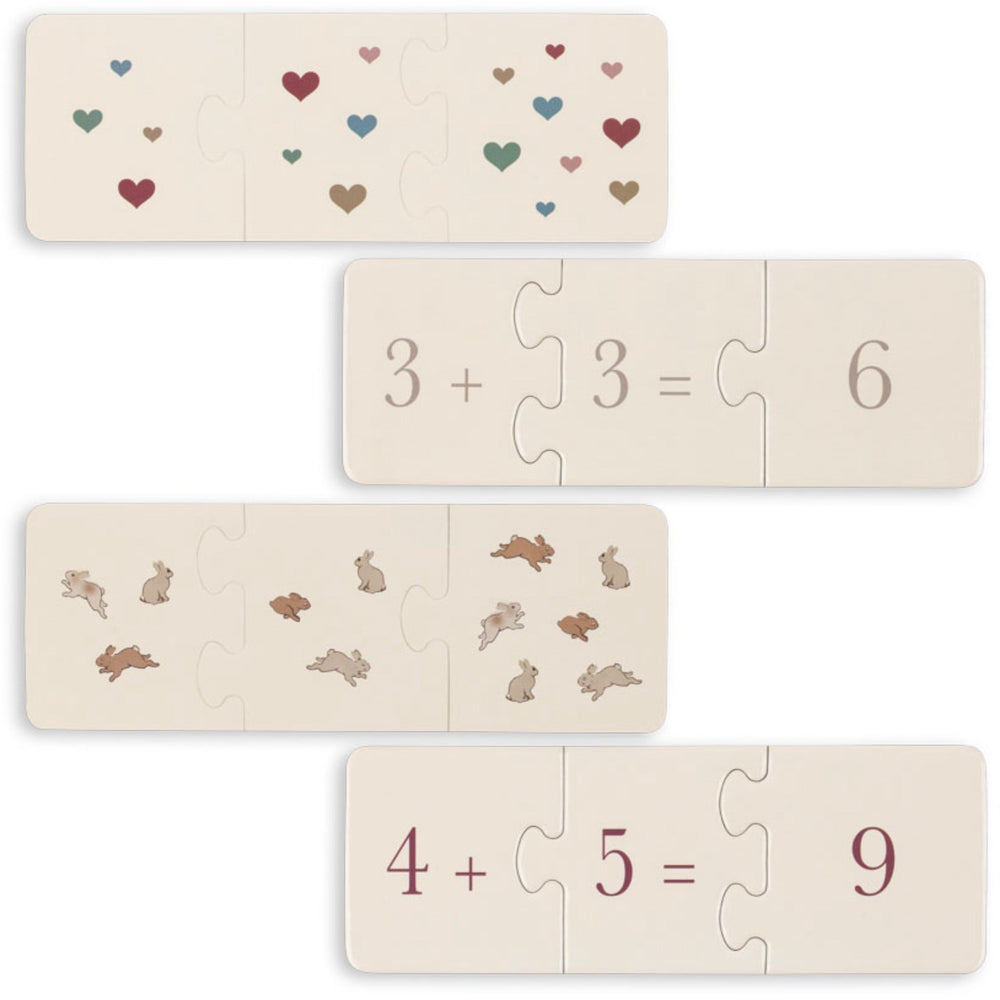 Enter the world of numbers with the Konges Sløjd Multi Cardboard Puzzle Math FSC, designed to make math engaging and fun for young minds. This beautifully crafted puzzle consists of 27 pieces that challenge children to match each number with the corresponding quantity represented in fun, eye-catching motifs.