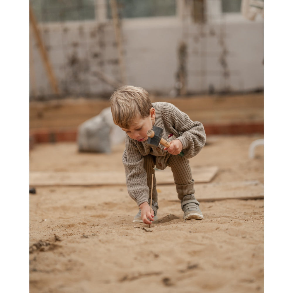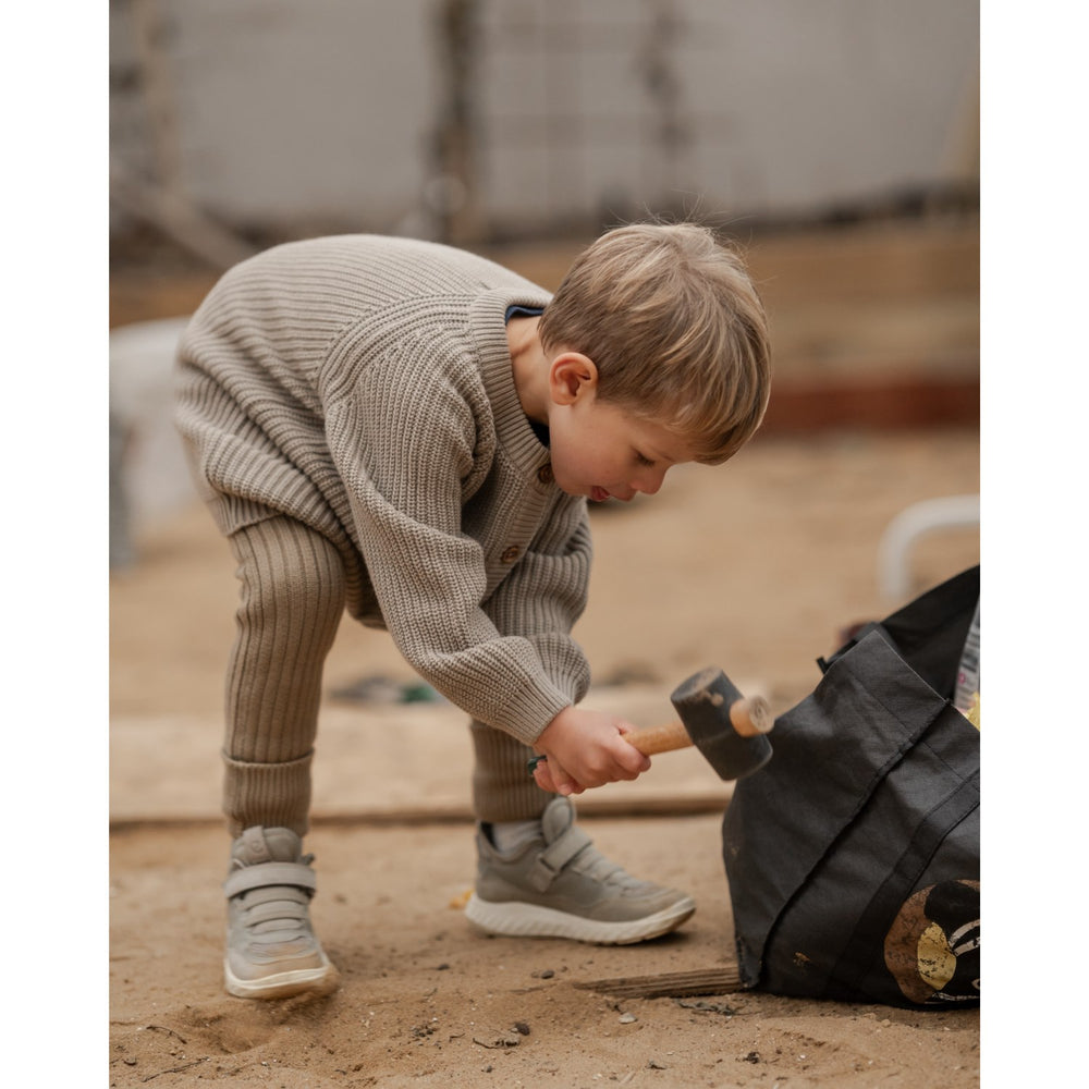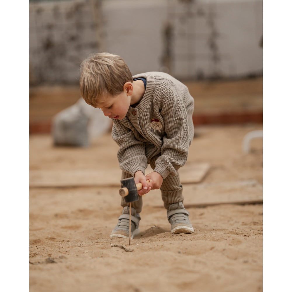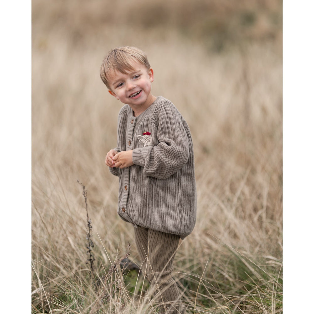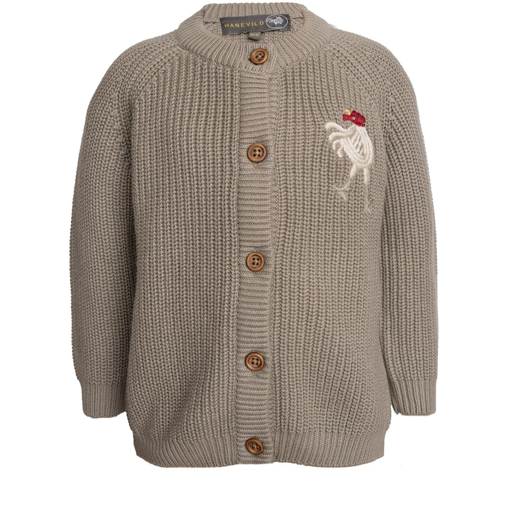 Wrap your little one in the charm and warmth of our Hanevild Caribou Kaj Cardigan. This delightful grey cardigan features dark wooden buttons and a unique hand-embroidered rooster on the chest. Crafted from 80% organic cotton and 20% merino wool, it ensures both comfort and durability. Easy to care for, simply wool wash and lay flat to dry. Perfect for cozy days in or adventurous outings, this cardigan blends style, sustainability, and practicality seamlessly.