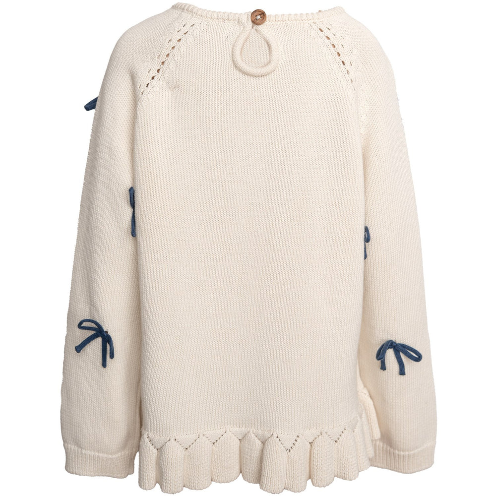 Introducing the Hanevild Ivory More Bows Sweater – a charming addition to any child's wardrobe. Expertly crafted from 100% organic cotton, this knitted blouse showcases delicate bows, a stylish loose fit, and a playful skirted bottom. Available in soothing ivory, it's designed for comfort with a button fastening at the back for easy wear. Suitable for gentle machine wash at 30 degrees, this sweater should be laid flat to dry to maintain its beautiful shape and delicate features.