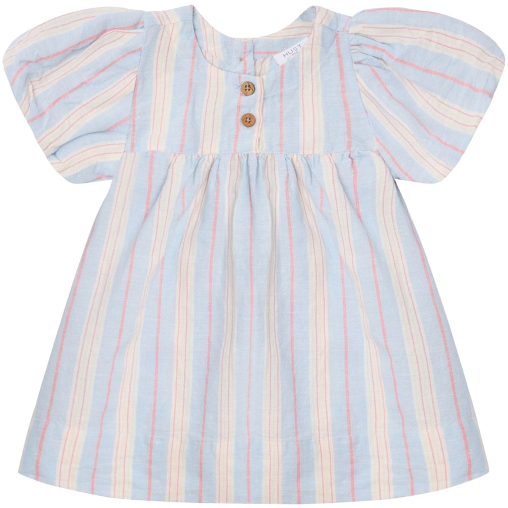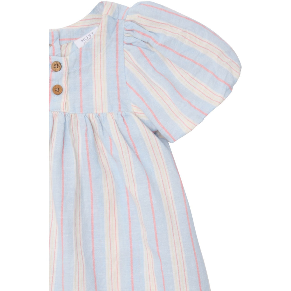 Introducing the Hust & Claire Winter Sky Kally Dress – a charming addition to any young girl's wardrobe. Crafted from a soft, woven cotton blend that includes 50% organic cotton, this striped dress combines style with sustainability. The ruched shoulders and puff sleeves add a touch of elegance, while the front button fastening ensures ease of wear. Its flared waist accentuates the stylish silhouette, making it perfect for any occasion.