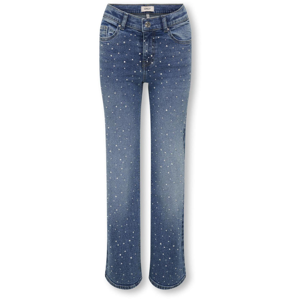 Dress your little ones in the coolest outfit with KIDS ONLY's Medium Blue Denim Rhinestones Kogjuicy Rhs Wide Leg Dnm Cro557 Noos. These stylish wide-fit jeans are not just fashionable but are crafted for ultimate comfort, featuring a roomy fit from hip to ankle. Made from high-quality denim, these jeans come with eye-catching rhinestone embellishments that add a fun twist to any outfit. Available in medium blue, they feature a classic button fly fastening, ample pockets including front, back, and a coin pocket, as well as practical belt loops. Perfect for all-day play or a family outing, these jeans ensure comfort, wearability, and durability. Delight in the blend of functionality and trendy street style with these must-have kids' jeans.