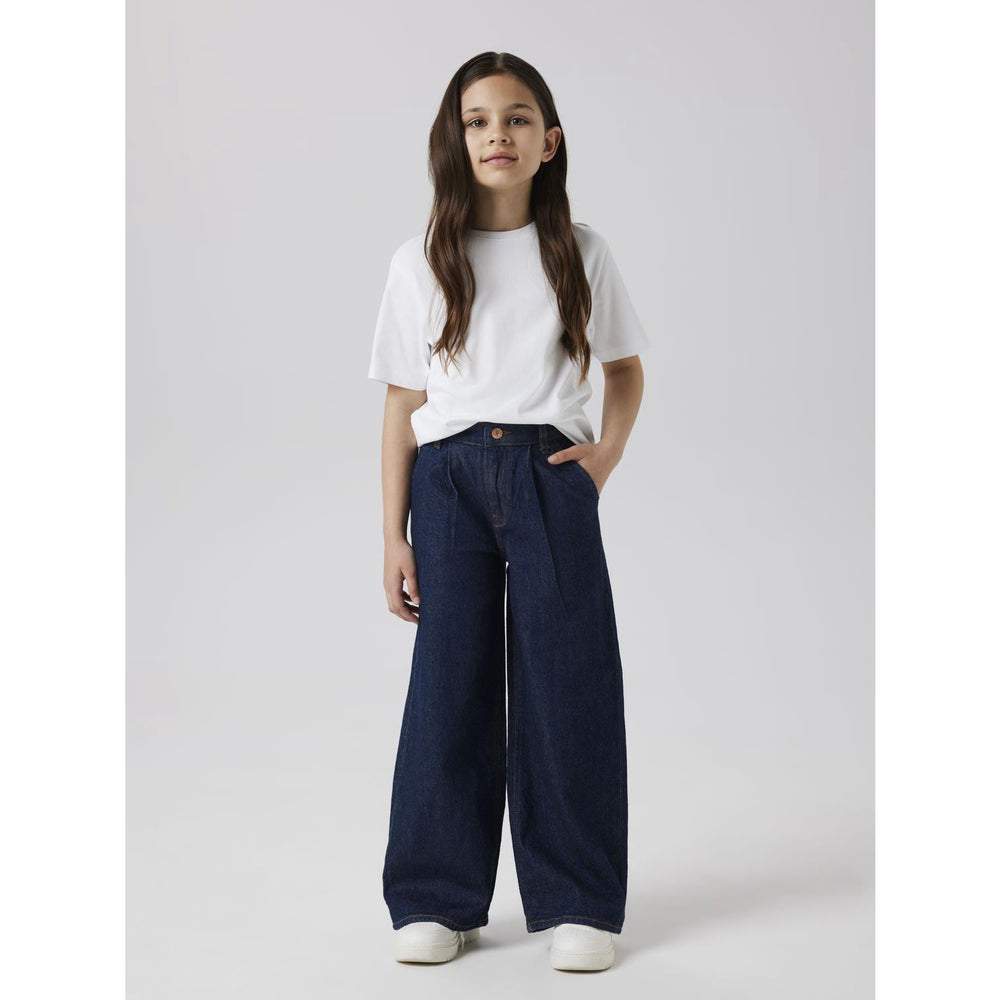 Introduce your child to the Name It Dark Blue Denim Unwashed Nkfbella Hw W Pleat Jeans, designed not only for style but also for comfort and freedom of movement. Crafted from durable denim, these jeans feature a unique unwashed dark blue hue with subtle abrasions that enhance their cool vibe. They are equipped with a convenient hook button and zip fly closure, and boast functional back and front pockets. The high waist design, coupled with an adjustable waistband, ensures a snug and comfortable fit, while added pleated details and tasteful rivets inject a dash of chic. With their baggy fit at the hips and wide leg style, these jeans promise all-day wearability, perfect for active kids. Care is straightforward, maintaining their quality and look. Opt for these versatile jeans that adapt to various occasions, ensuring your child looks great and feels comfortable wherever they go.