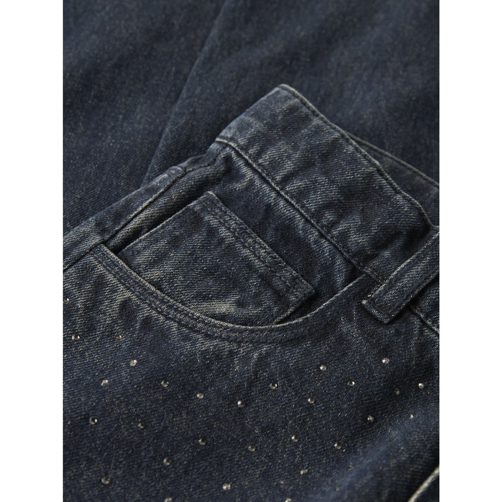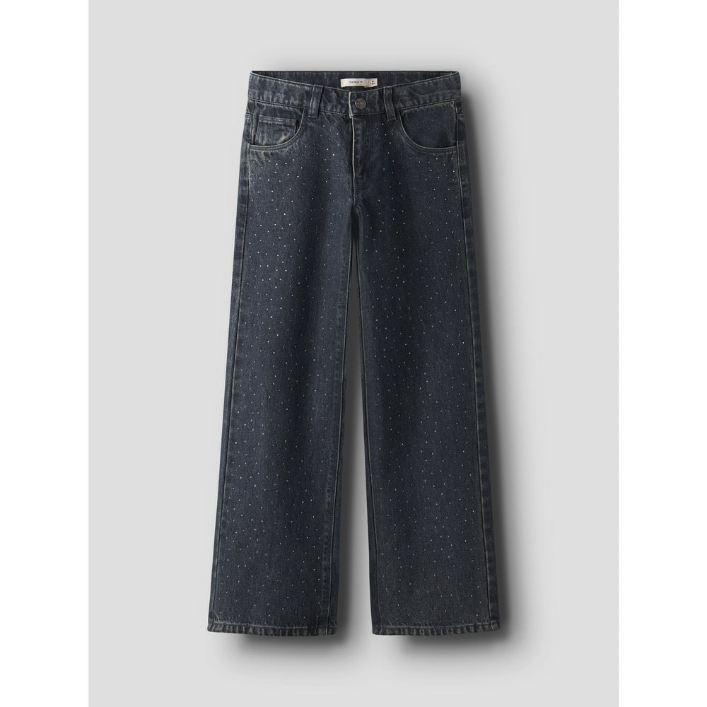 Dress your little one in our Name It Dark Midnight Denim Nkfrose Wide Rhine Jeans, an essential piece for any child's collection. Crafted from durable denim that ensures longevity and adaptability through all seasons, these jeans are not only stylish but also comfortable. They come in a classy dark midnight color, embellished with subtle rhinestone details for that added sparkle. Designed with a wide fit through the legs and a regular fit at the hips, they provide the perfect blend of comfort and style. The jeans feature a practical hook button and zip fly closure, alongside comprehensive pocket options including back, front, and a handy coin pocket. Finished with subtle abrasions for a slight edge, these jeans are easy to care for and maintain their high quality over time. Perfect for both trendy occasions and everyday wear, they offer a combination of fashion and functionality that will keep your child looking their best.