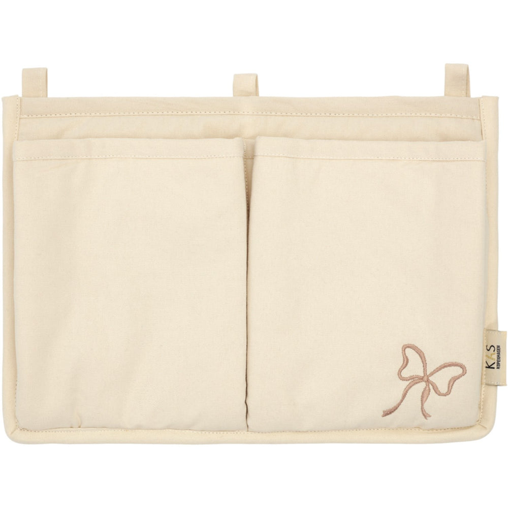 Discover the charm and utility of our KAS Kopenhagen Cream Bow Embroidered Bed Pocket. Perfectly designed for your little one's cot, this bed pocket keeps essentials like pacifiers and comfort cloths at hand. Made from organic canvas cotton, it not only promises durability but also maintains its pleasing structure for easy access. The Velcro fastening allows for secure and straightforward attachment, making it an elegant yet practical addition to your child's nursery. Ideal for organizing and stimulating self-reliance in young children, this bed pocket blends functionality with a touch of style. Materials: 100% Cotton/Satin