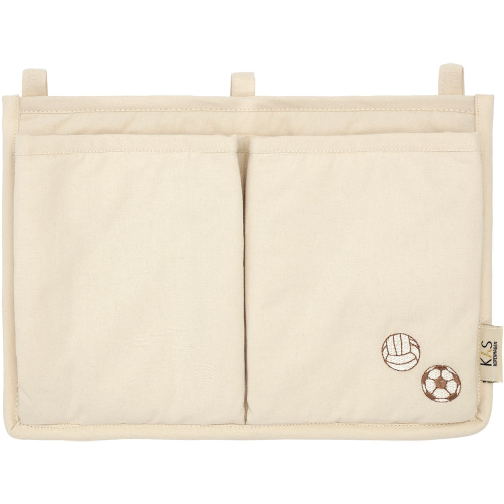 Discover the delightful KAS Kopenhagen Cream Soccer Embroidered Bed Pocket, perfect for keeping your little one's essentials like pacifiers and comfort cloths within arm's reach. This charming bed pocket, made from sturdy organic canvas cotton, ensures durability and maintains its shape, making items easily accessible for your child. The ease of the Velcro fastening guarantees that it remains securely attached to the cot, adding both function and elegance to your baby's nursery. Ideal for organizing small items neatly, this bed pocket is an essential addition for a clutter-free and soothing sleeping environment. Materials: 100% Cotton/Satin