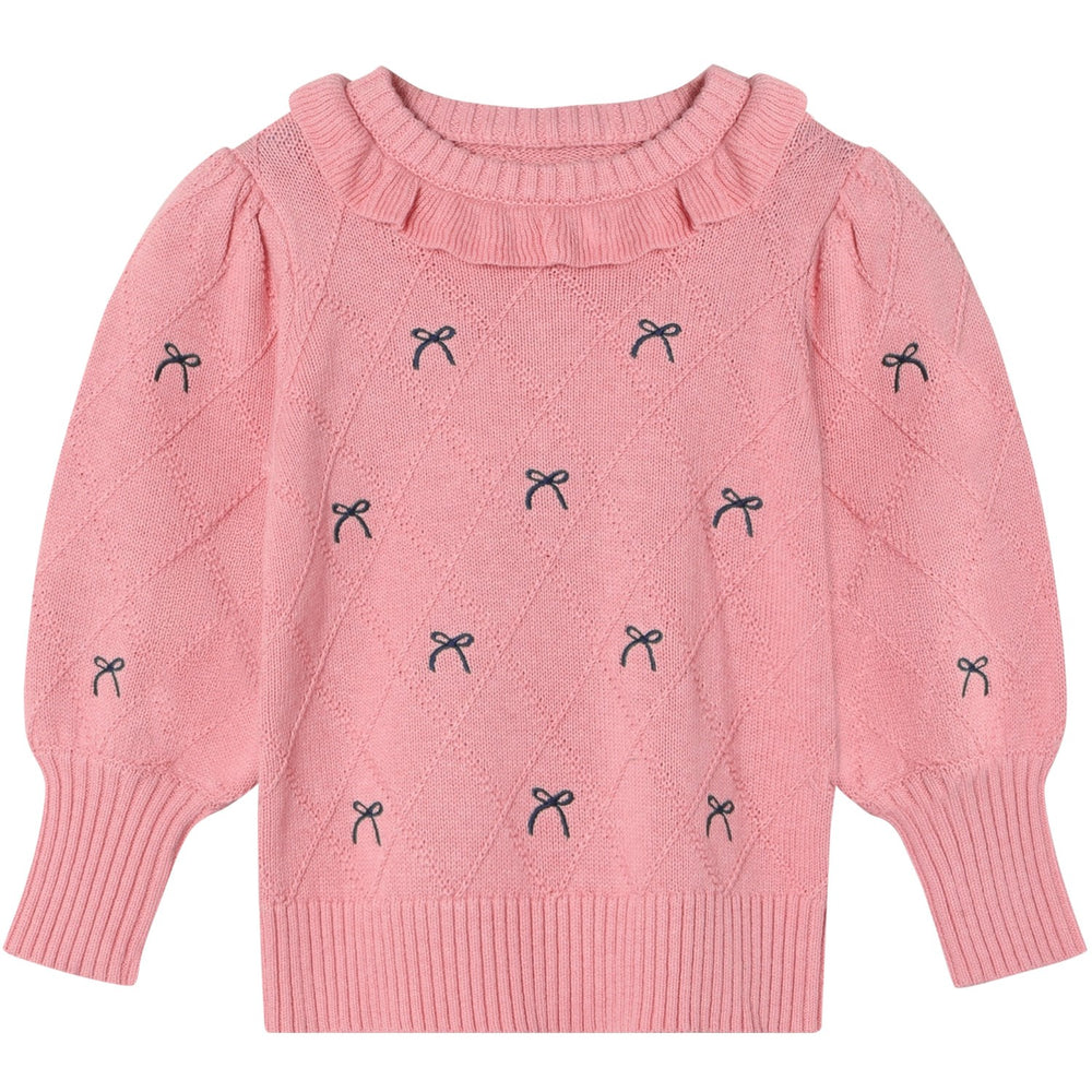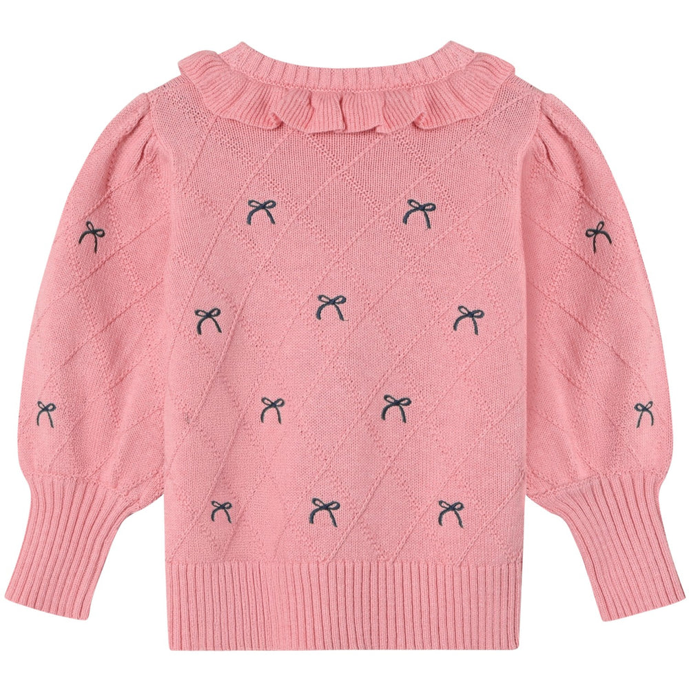 Brighten up your little one's wardrobe with the Fliink Candy Pink Lucie Bow Pullover, a charming addition that combines cosiness with style. This pullover is expertly knitted from 85% organic cotton and 15% wool, ensuring a soft and comfortable wear. It features an enchanting harlequin pattern complemented by embroidered bows on both sleeves, front, and back, adding an element of whimsy. The garment is designed with puff sleeves and pleats at the shoulders enhancing its elegant silhouette, while a high rib edge at the wrists and a round neckline with a collar detail round off its distinctive aesthetics. Perfect for daily wear, it's easy to care for – simply machine wash as per instructions and lay flat to dry. Suitable for all occasions, this pullover ensures your child stays warm without compromising on style.