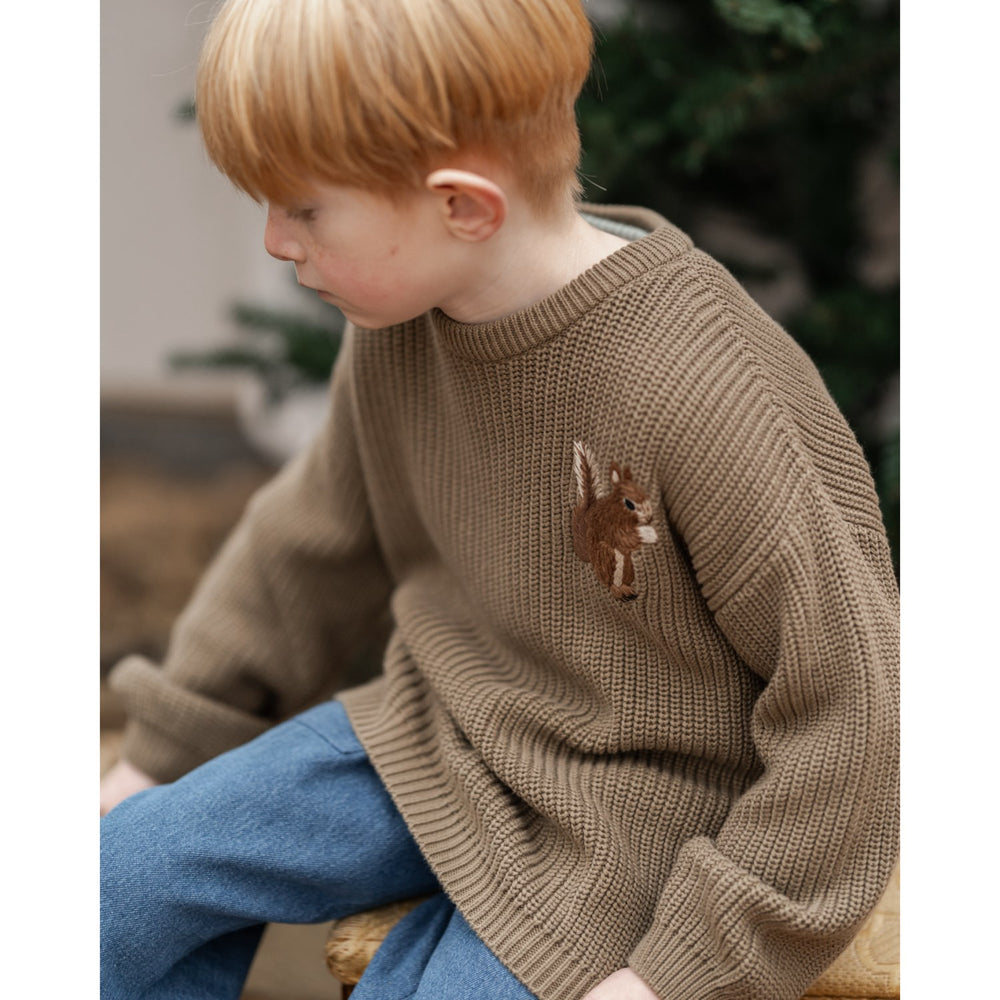Introduce your little one to the charm of our Hanevild Coriander Lauge Blouse. This cozy knitted sweater is lovingly crafted from 100% organic cotton, featuring a delightful hand-embroidered squirrel on the chest. Available in a soothing color, it offers both comfort and style. Designed for easy care, it can be washed at 30 degrees and should be laid flat to dry, making it perfect for everyday wear. This sweater blends functionality with an adorable design, ensuring your child looks great while staying comfortable.