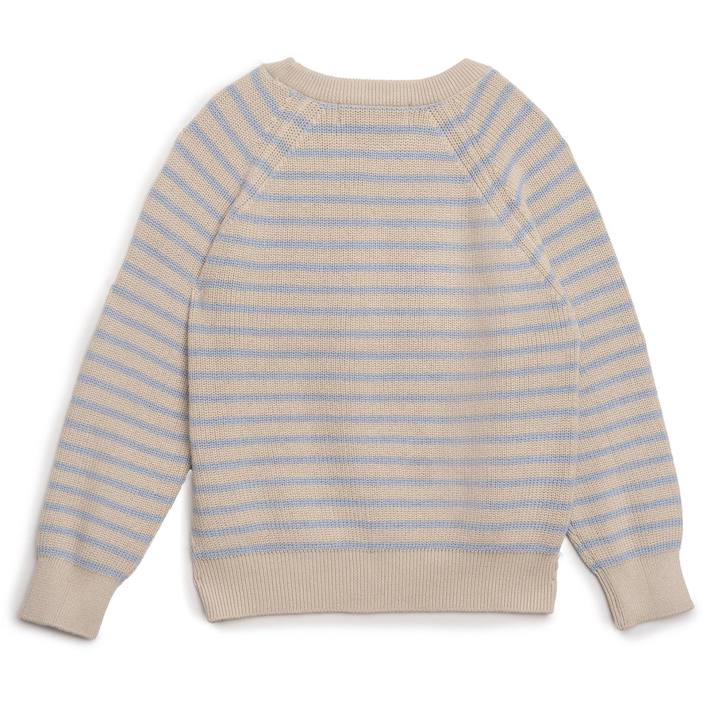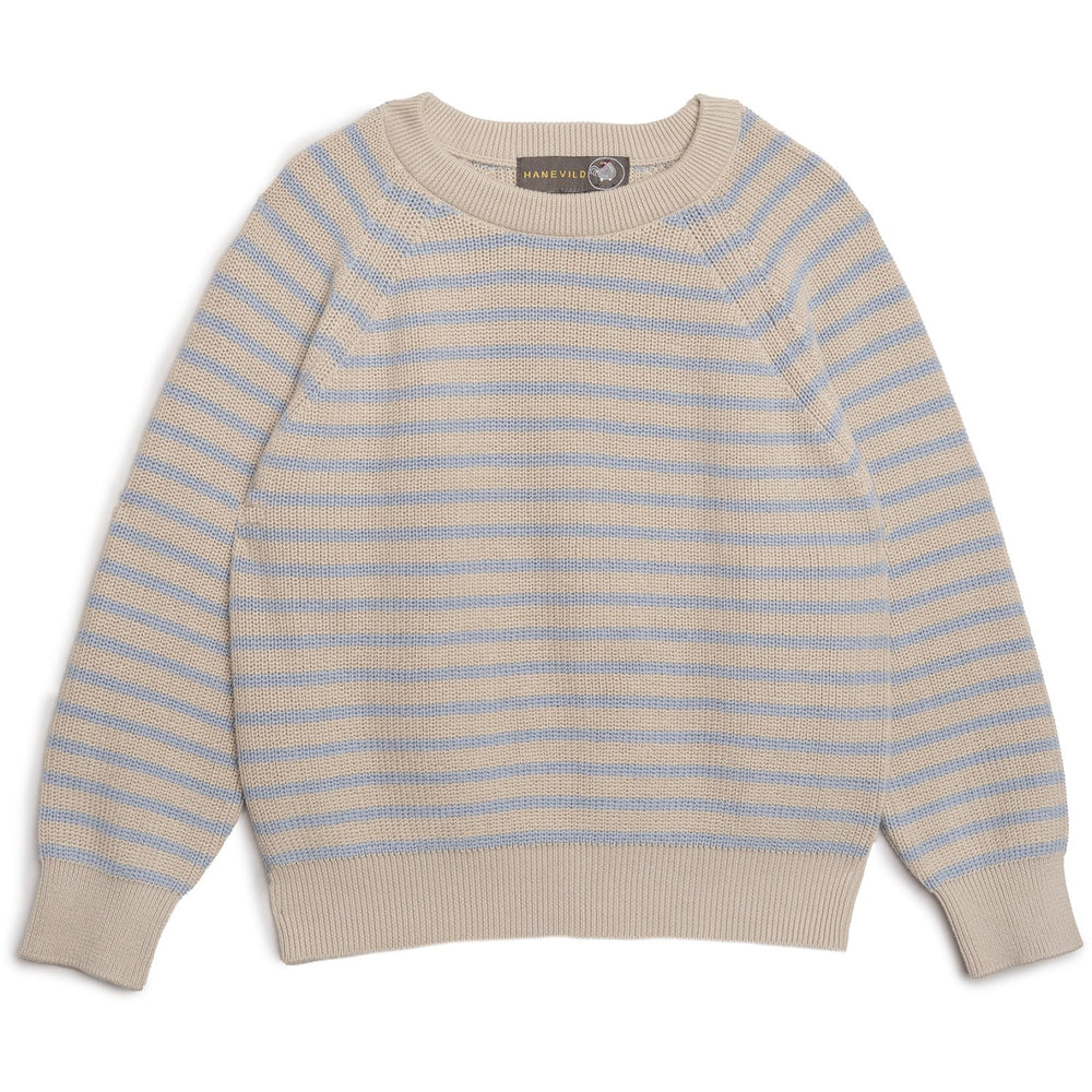 Introducing the Hanevild Summer Sand Christian Sweater: a cozy staple knitted from 100% organic cotton, ideal for child-friendly wear. This sweater showcases a classic striped design in subtle beige and light blue, featuring a comfortable round neckline and long raglan sleeves. Its snug ribbed trims ensure the sweater maintains its shape. Easy-care instructions include machine washing and air-drying, ensuring longevity and continued comfort. Perfect for daily wear and versatile enough for various occasions, this sweater promises to keep your little ones stylish and warm. Materials: 100% organic cotton