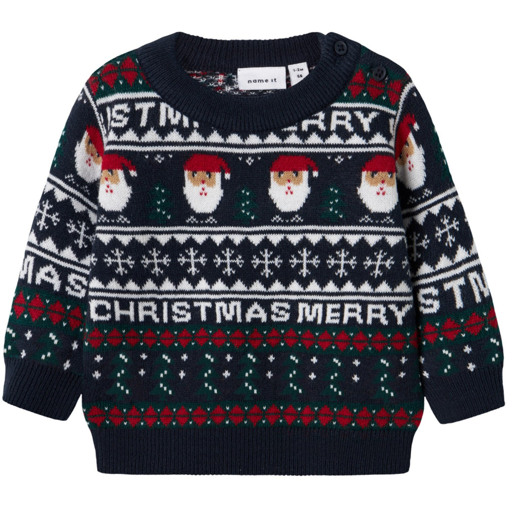 Dress your little one in the Name It Dark Sapphire Nbnrasto Knit Pullover for a magical holiday spirit. This charming knit features a detailed jacquard pattern that provides a textured, timeless style. Its round neck, long sleeves with ribbed cuffs, and button fastenings offer a regular fit, ensuring easy wear and comfort. Perfect for festive occasions, this pullover not only looks great but is also practical, with care instructions cautioning to keep it away from fire. Brighten up your child's wardrobe with this joyful attire!