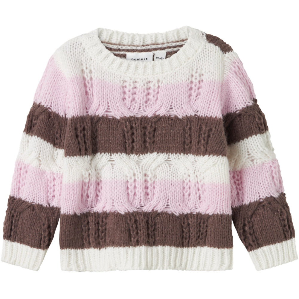 Dress your child fashionably with the Name It Peppercorn Nmfnibo Ls Knit pullover. This cozy knitted top features an intricate pointelle pattern creating an elegant geometric design. Ideal for everyday wear, it sports a comfortable round neck, long sleeves with ribbed cuffs, and a regular fit that ensures comfort all day long. Perfect for various occasions, this pullover is not only stylish but also easy to care for.