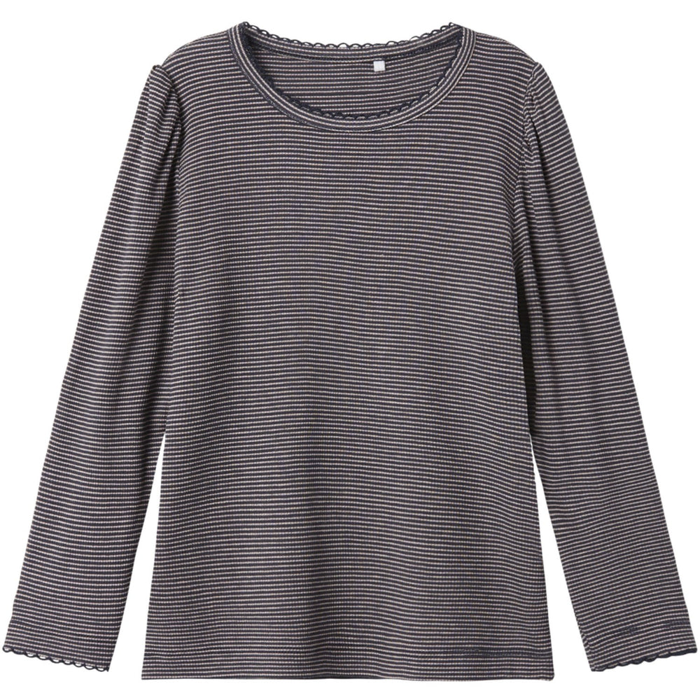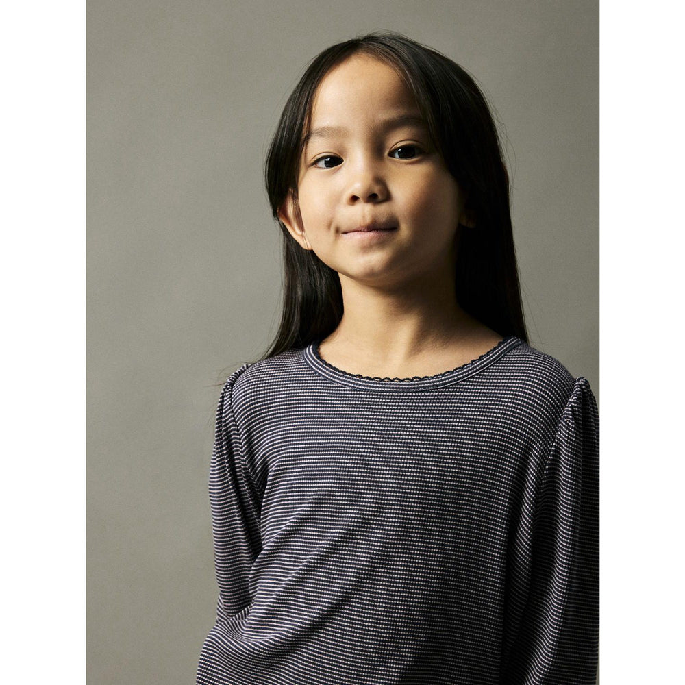 Delight your little one's closet with the Name It Inkwell Odina Blouse, an ideal blend of style and comfort. Crafted from stretchy rib-knit fabric in a chic vertical stripe pattern, this blouse boasts a classic round neck and charming puff sleeves enhanced with exquisite stitching details. The regular fit ensures a comfortable wear for any event, and it's perfect for both casual and special outings. Easy to care for, this T-shirt style top is both durable and fashionable.
