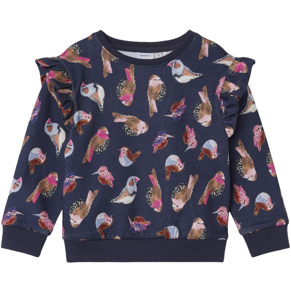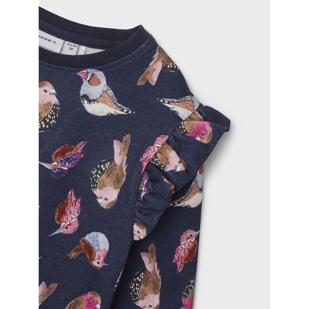 Introduce a splash of style and comfort to your child's everyday outfit with the Name It Peacoat Niasigne Regular Heavy Jersey Blouse. This sweatshirt, crafted from soft cotton, features a classic O-neck and long sleeves with cozy ribbed cuffs. The charming ruffle details and the playful all-over print make it irresistibly trendy. Designed for a regular fit, it ensures easy wearability and movement for all-day play. Ideal for pairing with jeans or skirts, this blouse is as versatile as it is fashionable and promises easy care for busy parents. A perfect blend of durability and adorable design, this blouse is a wardrobe must-have for any fashion-forward child.
