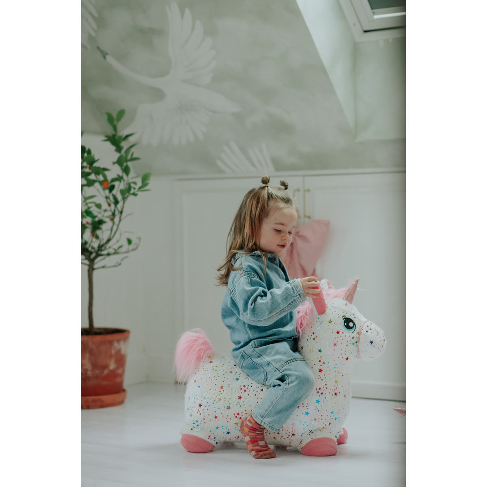 Introducing the delightful KREA® Hop & Bounce Plush Unicorn! Designed to enchant little ones from 12 months and up, this plush unicorn features rainbow-colored stars and ensures safe, bounce-filled fun. It enhances motor skills and is ideal for exciting gymnastic play. Easy to inflate and store, it makes for the perfect companion in both play and development.