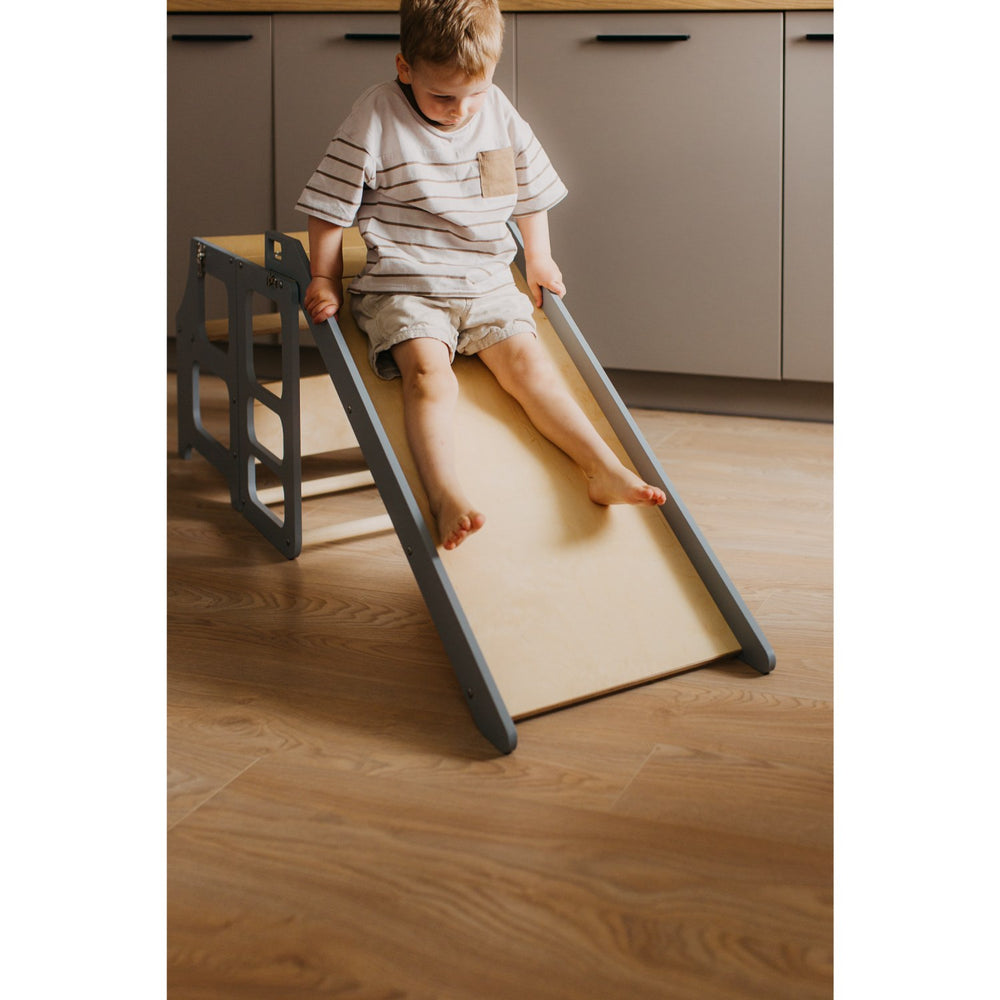 Duck Woodworks Foldable Learning Tower in grey is ideal for kids who want to help out in the kitchen or at other work surfaces. It provides a safe platform for the child to participate in cooking and other daily activities, strengthening their independence and motor development. When not in use, the tower can be easily folded up for convenient storage or used as play equipment with the slide extended.