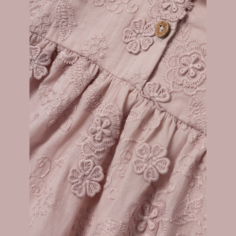 The dress comes with long sleeves for added coverage and boasts elasticated cuffs to ensure a snug fit around your child’s wrists. The grandad neck and dual button and press stud fastenings make dressing quick and hassle-free, upholding both style and practicality. Thanks to its loose fit, the dress provides ample room for movement, making it ideal for playtime or special occasions.