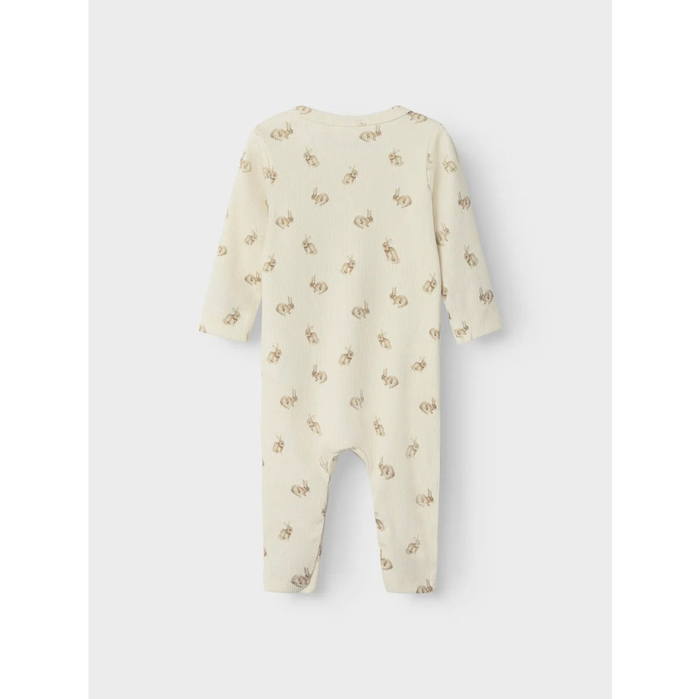 This romper features a charming, all-over rabbit print that promises to delight your child, adding a touch of whimsy to their wardrobe. The neutral turtledove color adds versatility, making it easy to match with other accessories. It includes a practical press-stud fastening for easy dressing and undressing, which is especially convenient for changing diapers or quick changes.