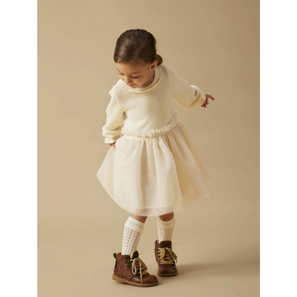 Introducing the Lil'Atelier Pistachio Shell Nmfsarina Ls Knit Dress, a stunning addition to any child's wardrobe, blending elegance with comfort. This dress is crafted from a soft, breathable knit with a cozy organic cotton lining, ensuring your little one stays comfortable throughout their day. Featuring a charming round neck and long sleeves with delightful frilled cuffs, this piece is both stylish and practical.