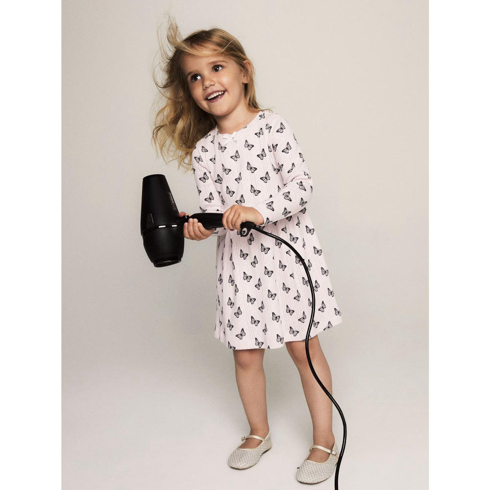 Introducing the Name It Ballerina Dyna Dress, a charming addition to any young girl's clothing collection. Crafted with unique needle drop fabric featuring playful dropped stitches, this dress ensures a cute and distinctive pattern. The long-sleeved design, adorned with a decorative bow and a delightful all-over print, complements its round neck and standard fit. It combines style with comfort and is ideal for a variety of occasions. Easy to care for, this dress balances comfort, functionality, and adorable fashion. Perfect for a stand-out look throughout the seasons!