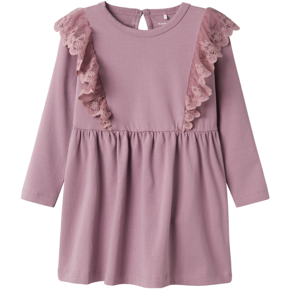 Discover the enchanting Name It Elderberry Tinsley Dress, designed to keep your little one looking stylish and feeling comfortable on any occasion. Crafted from soft, stretchy jersey fabric, this dress features a cozy cotton lining and a charming round neck complemented by long sleeves with delightful frill details. Available in regular fit, it ensures ample freedom of movement. The button and loop fastening adds a practical touch for easy dressing. Ideal for both seasonal celebrations and everyday wear, this dress combines durability with a dash of whimsy, making it a perfect addition to your child's collection.