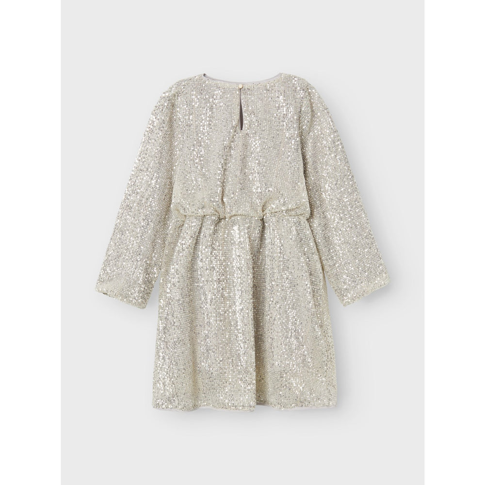 Dress your child in the enchanting Name It Frosted Almond Nkfrantella Ls Dress and watch them shine at any celebration. Crafted from woven fabric with a criss-cross pattern, this dress boasts a subtly textured, classic appearance. Featuring a comfortable O-neck and stylish balloon long sleeves with elasticated cuffs, it offers both fashion and functionality. The dress is elegantly completed with sequin details and an elasticated waist for a flattering fit. Button and loop fastening at the back ensure easy dressing, while the polyester lining provides opacity. Perfect for memorable moments, this dress combines charm with ease of care.