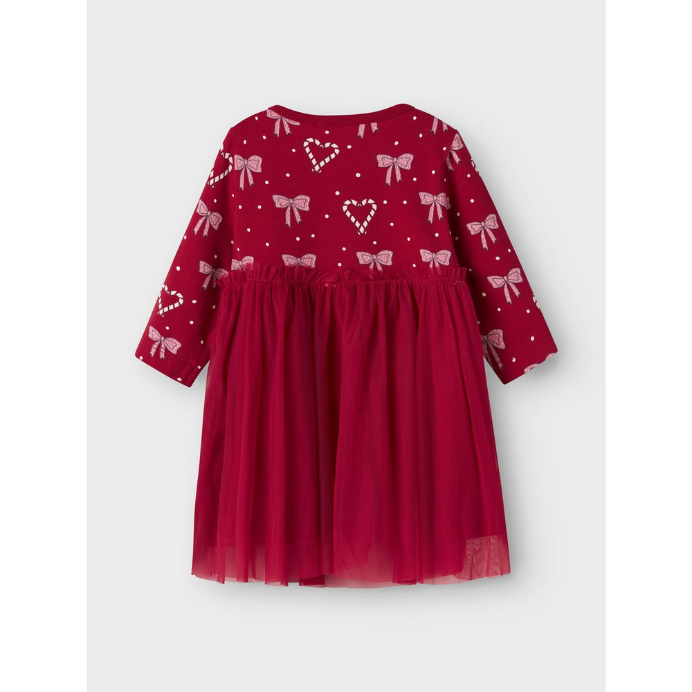 Dress your little one in the Name It Jester Red Nbfri Ls Dress for standout festive flair! Crafted from cozy, stretchy jersey fabric, this dress is comfort epitomized with a smooth inner feel and free-moving design. Featuring a charming all-over print, delicate tulle details, and practical press stud fastenings for easy dressing, it's perfect for holiday celebrations. Ensure safety near flames with its fire warning and enjoy the ease of care with its durable material. Ideal for creating memorable moments this Christmas season!