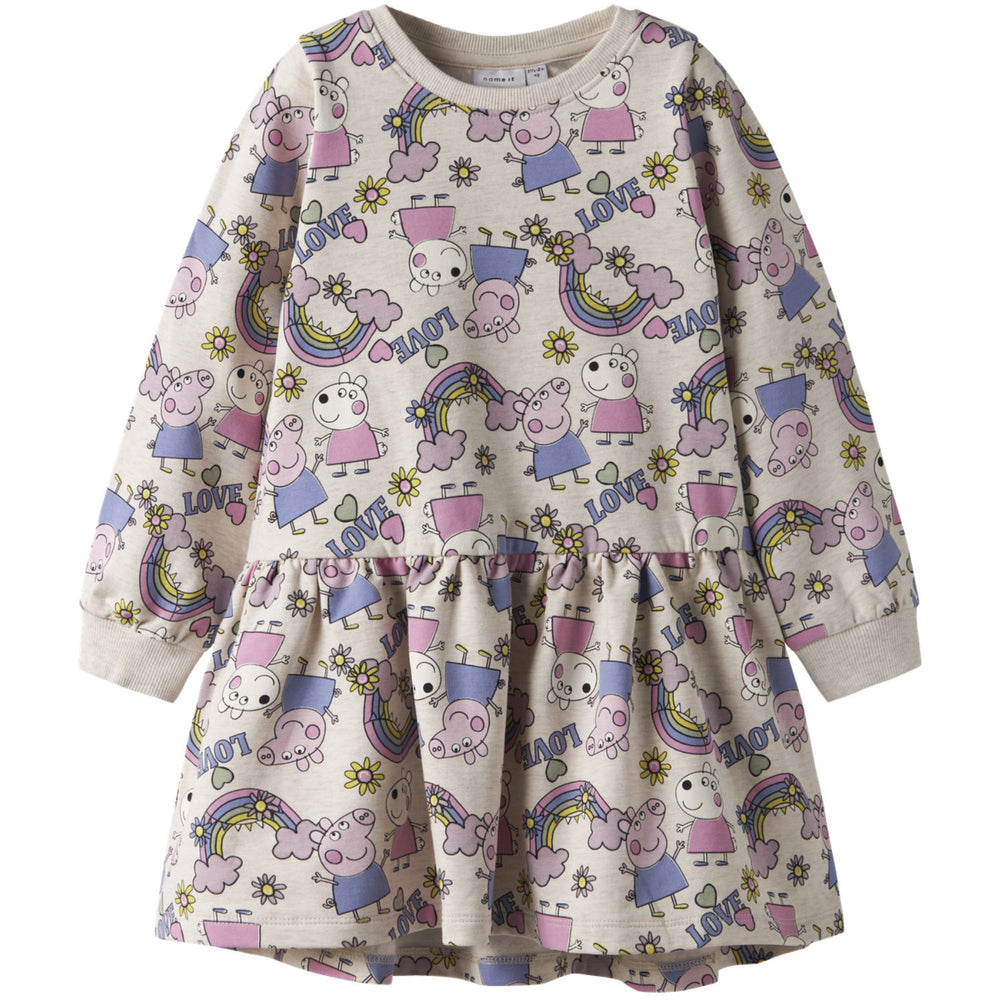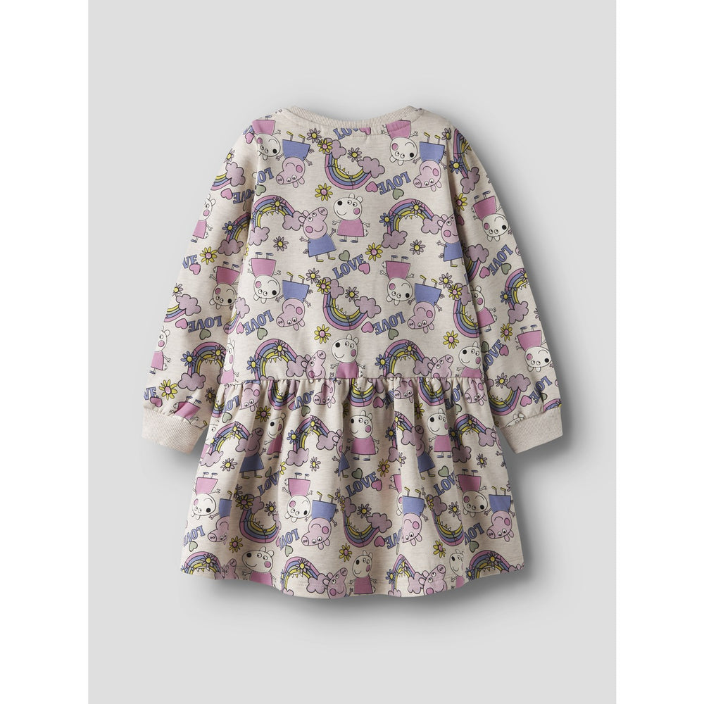 Brighten up your little one's wardrobe with our charming Peppa Pig themed dress. Crafted from brushed sweat fabric, this garment is delightfully soft inside, ensuring ultimate comfort. The dress features a fun, all-over Peppa Pig print, appealing to young fans of the playful, little piggy who loves adventures with friends and family. Designed with long sleeves and a comfortable round neck, it offers a regular fit perfect for active play. This adorable dress is also easy to care for, but please heed the important caution to keep it away from fire. Ideal for versatile year-round wear, it’s a stylish and cozy choice for any young Peppa Pig enthusiast.