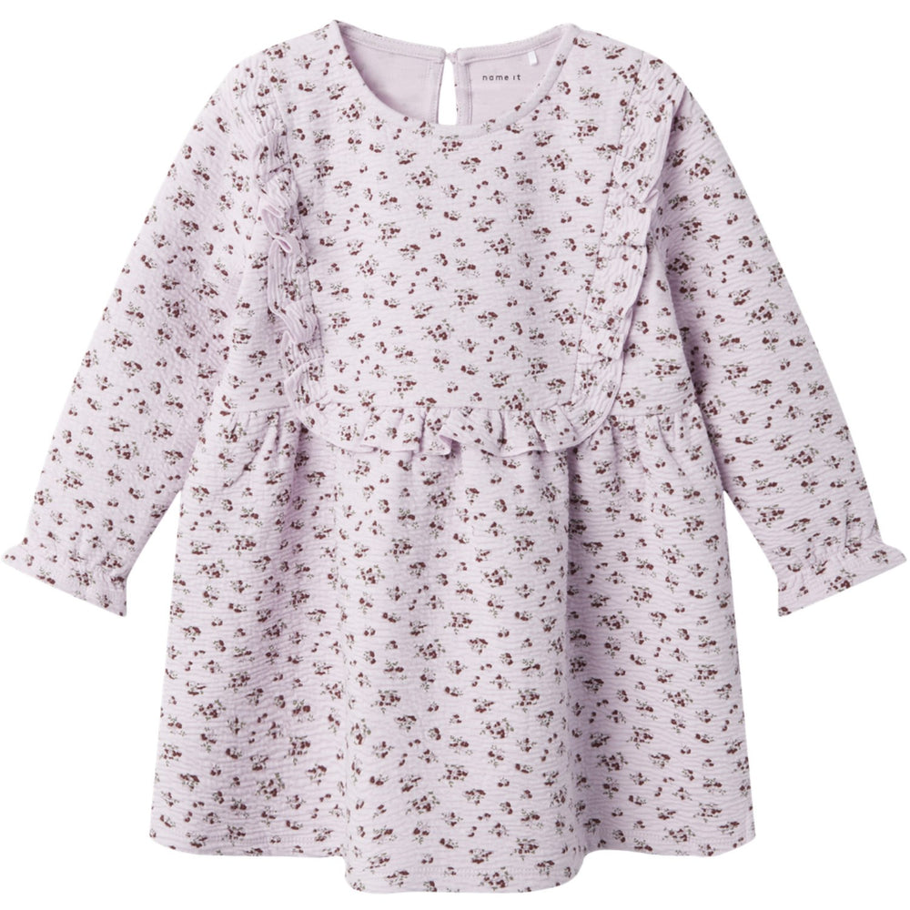 Dress your little one in the Name It Winsome Orchid Tolly Dress, an elegant addition perfectly suited for any season and occasion. Crafted from the intricate jacquard fabric, this dress features a charming woven pattern that enhances its stylish appeal. This delightful ensemble showcases a round neck and long sleeves with comfortable elasticated cuffs. The easy-to-use button and loop fastening allows for quick dressing.