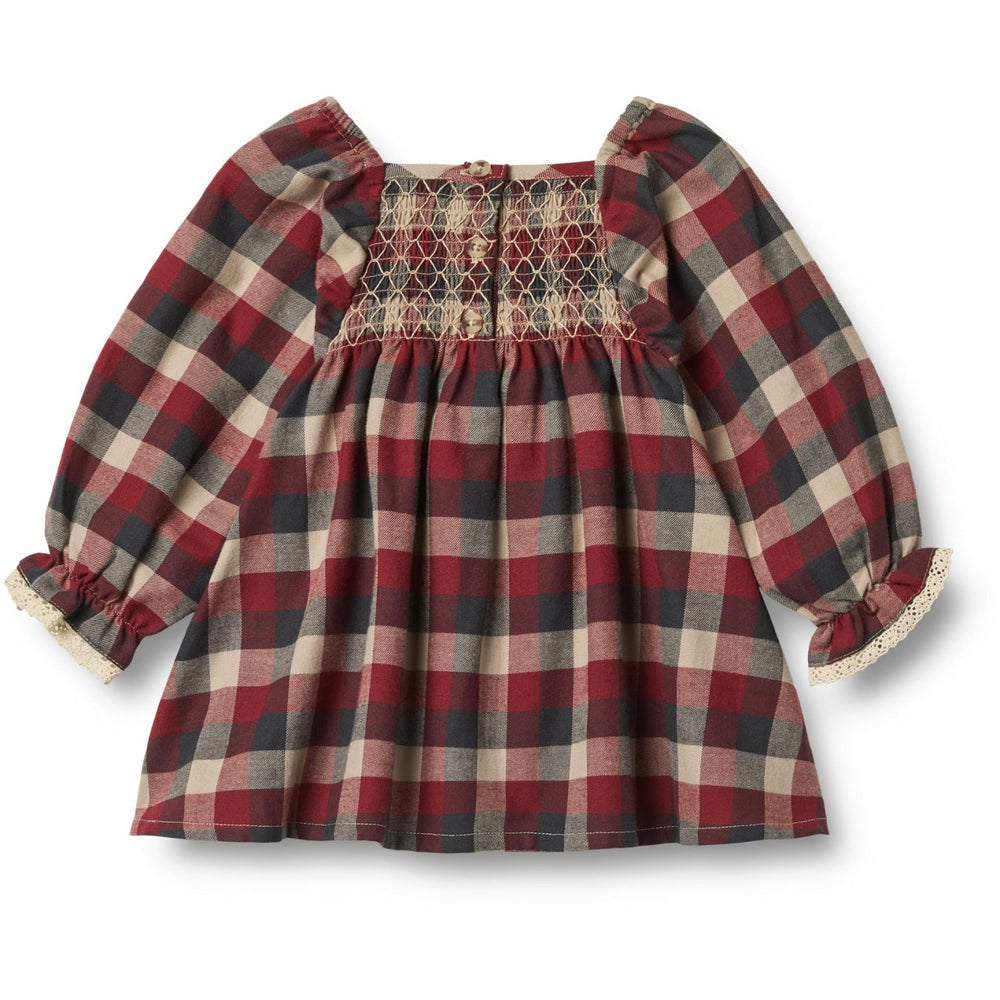 Discover the charming Wheat Red Blue Check Dress L/S Lace Bella, crafted from 100% GOTS-certified organic cotton to ensure softness against your baby's skin. This beautiful long-sleeved dress features exquisite smock details at the chest and a unique wide neckline, enhancing its adorable checkered design. With its loose fit and balloon sleeves, it combines style with ultimate comfort. Practical buttons at the back and cute lace details on the sleeve cuffs add functional elegance. Perfect for pairing with tights or a cozy knit, this versatile dress is ideal for both daily wear and special occasions, keeping your little one comfortably stylish throughout the day. Materials: 100% organic cotton Washing instructions: Remember to follow washing and user instructions Certifications: The product is GOTS certified