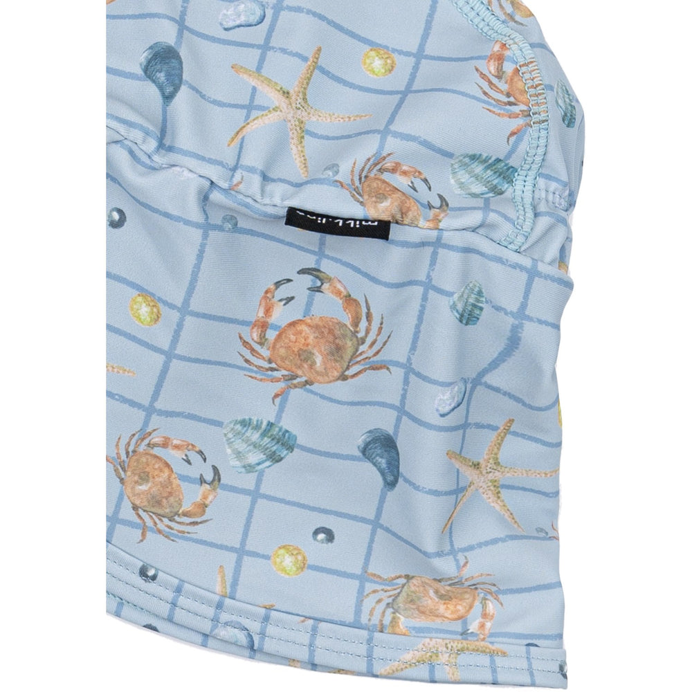 Dive into summer fun safely with the Mikk-Line Faded Denim Swim Hat UV AOP. Expertly designed to shield your little one from the sun, this hat features a thoughtfully engineered all-over print with a long neck brim and a shorter front brim to protect the face while providing ample shade for the eyes. Additionally, it boasts tie-strings for secure placement, ensuring it stays snug while they splash and play. Constructed from 82% GRS certified recycled polyester and 18% elastane, this quick-drying, stretchable swim hat is also OEKO-TEX® Standard 100 certified, affirming it's free from harmful substances. Perfectly paired with matching Mikk-Line swimwear, this swim hat is essential for any beach day or pool visit. Ensure longevity by simply rinsing in clean water after exposure to chlorine or salt water.
